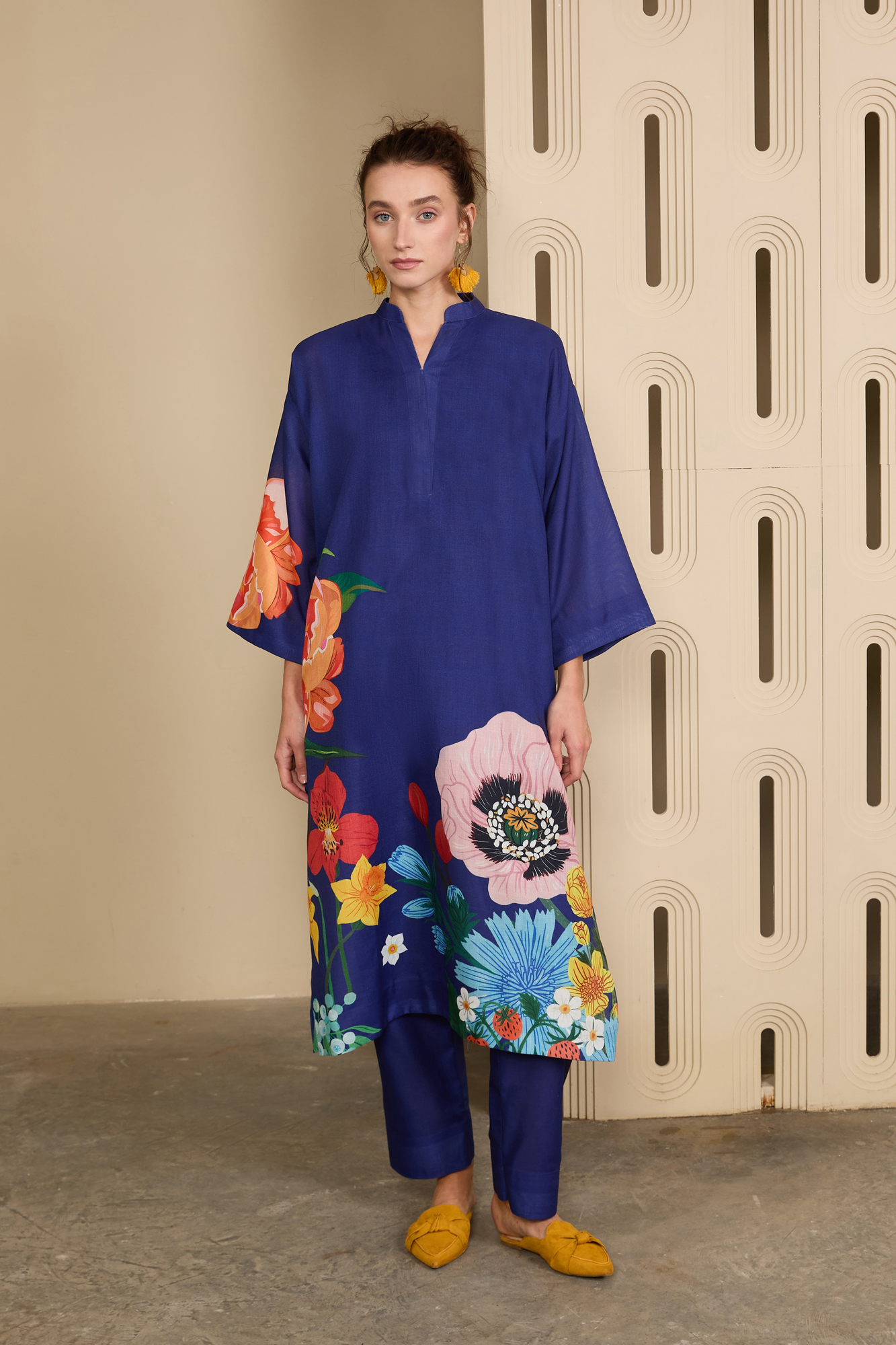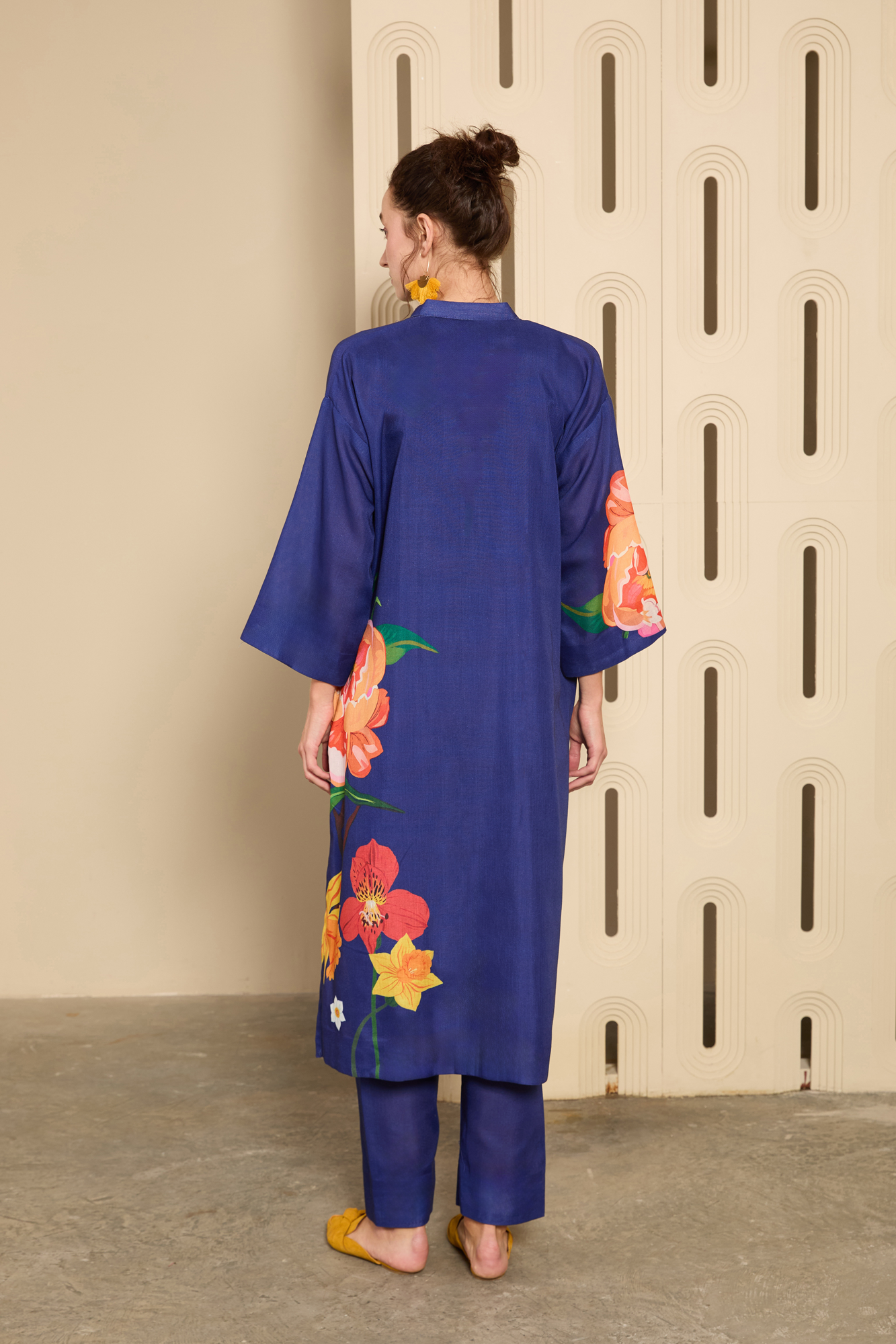 Introducing our Vibrant Blue Floral Tunic, a stunning blend of rich hues and nature-inspired elegance. Crafted from luxurious Soft Crepe fabric, this three-piece set includes a beautifully detailed tunic paired with a matching trouser and an intricately designed floral scarf. The bold, oversized floral prints create a lively yet sophisticated look, perfect for any occasion.