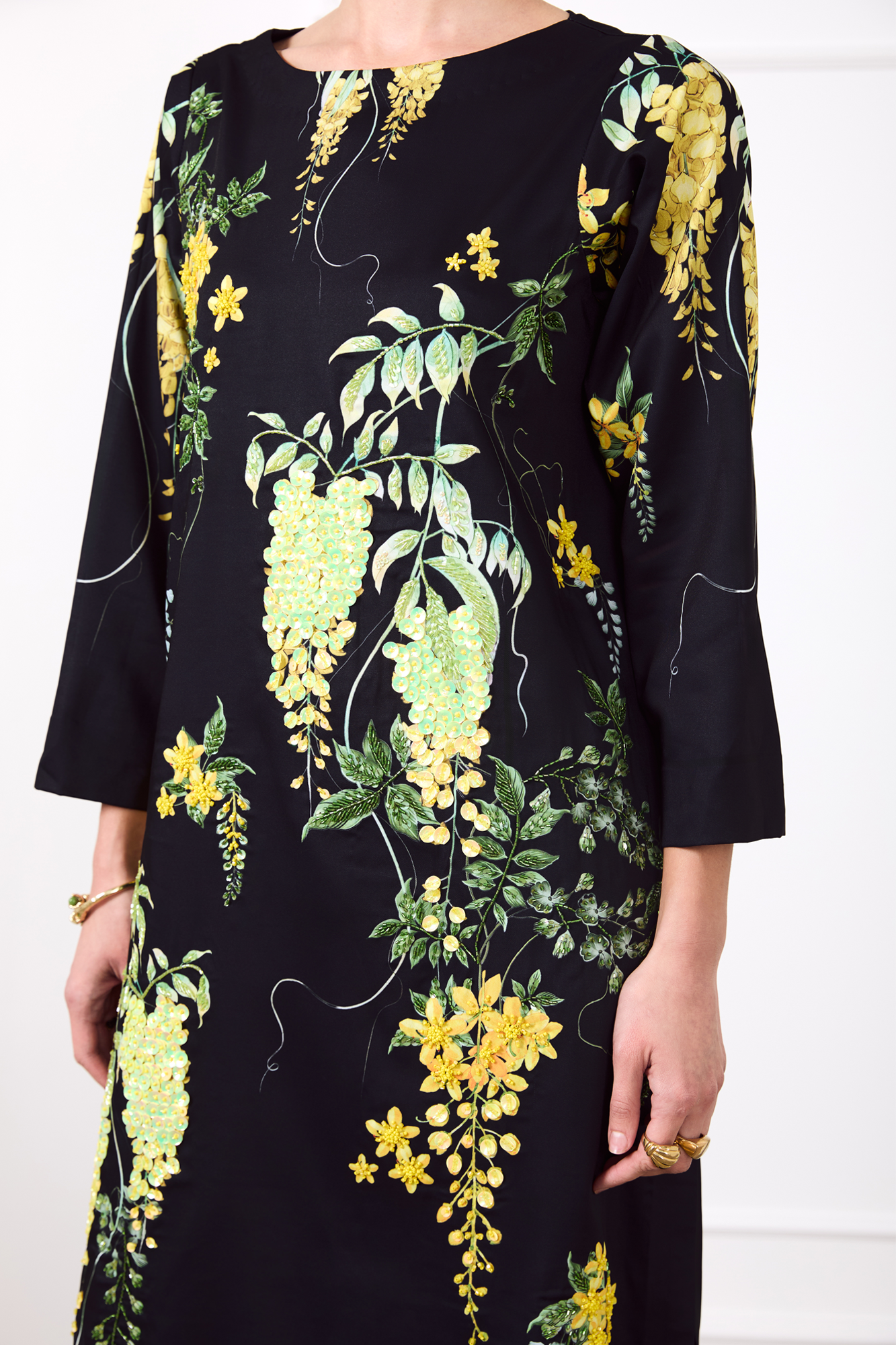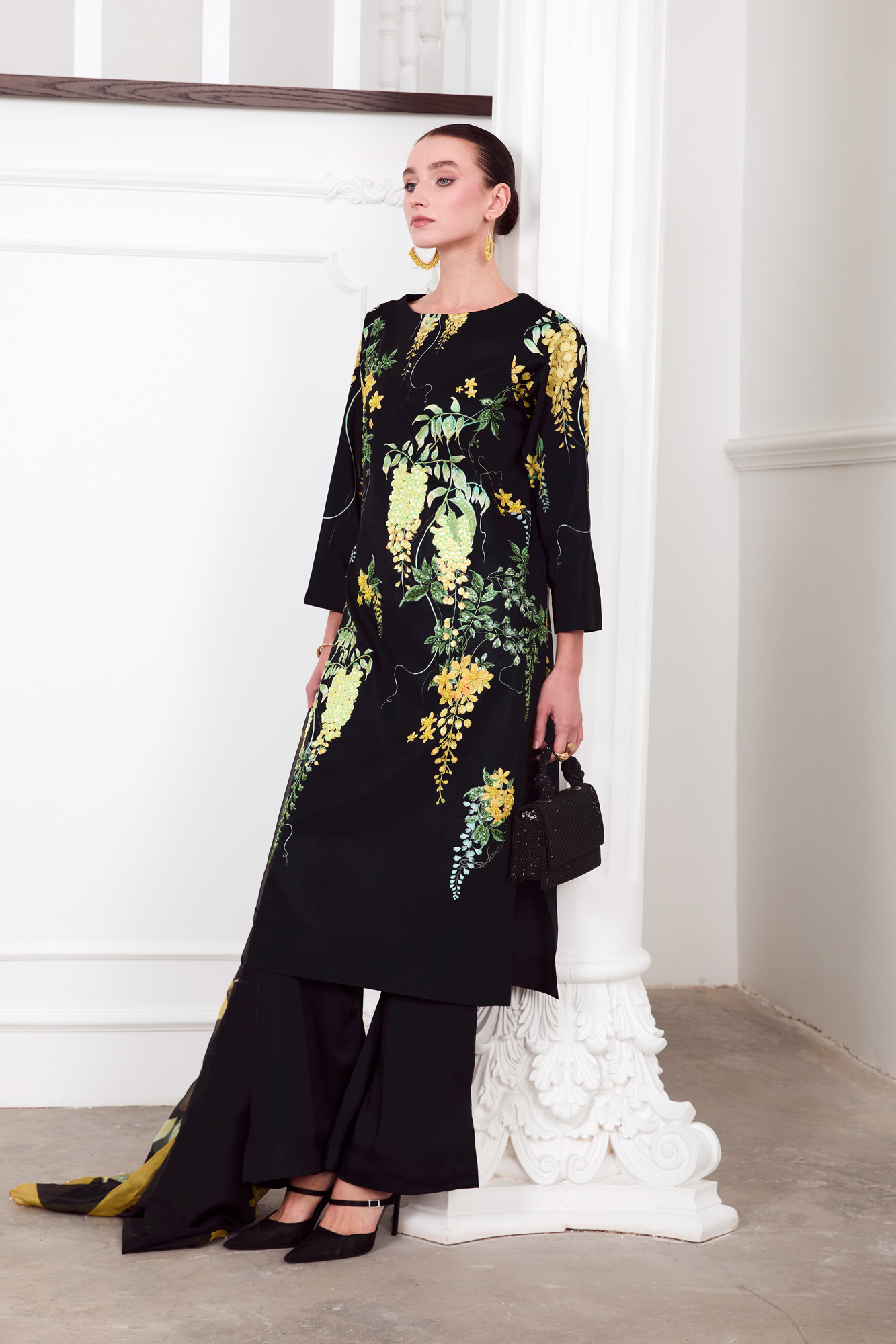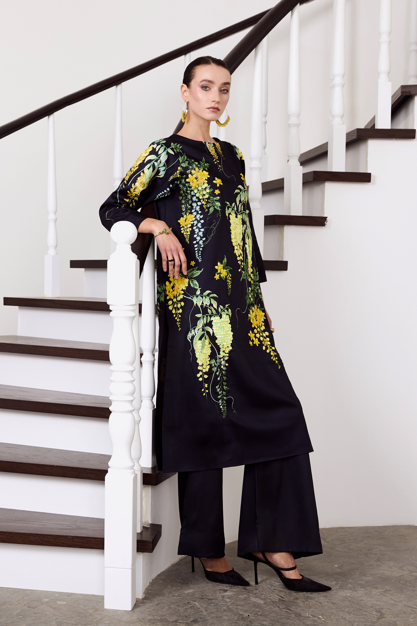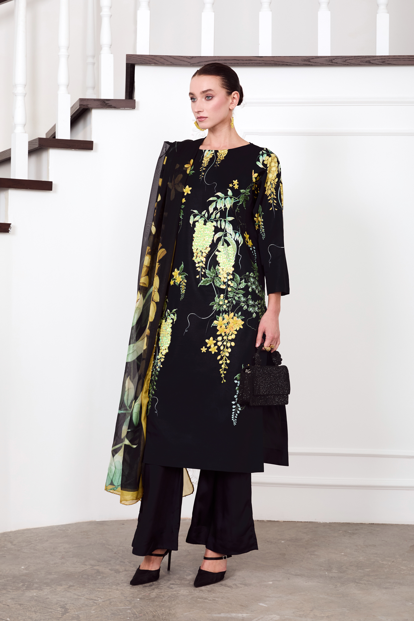 Midnight Bloom Ensemble Radiate timeless elegance in this Midnight Bloom Ensemble, featuring a rich Black base adorned with cascading floral motifs in vibrant shades of yellow and green. Crafted from luxurious Charmeuse Silk, it drapes beautifully, offering a subtle sheen and fluid silhouette that speaks of understated sophistication. Perfect for evening gatherings or festive occasions where grace meets modern charm.
