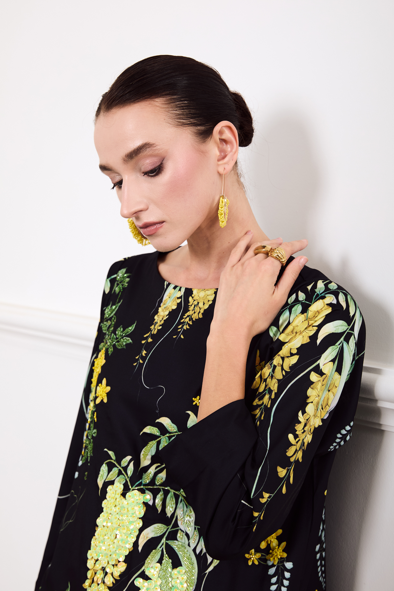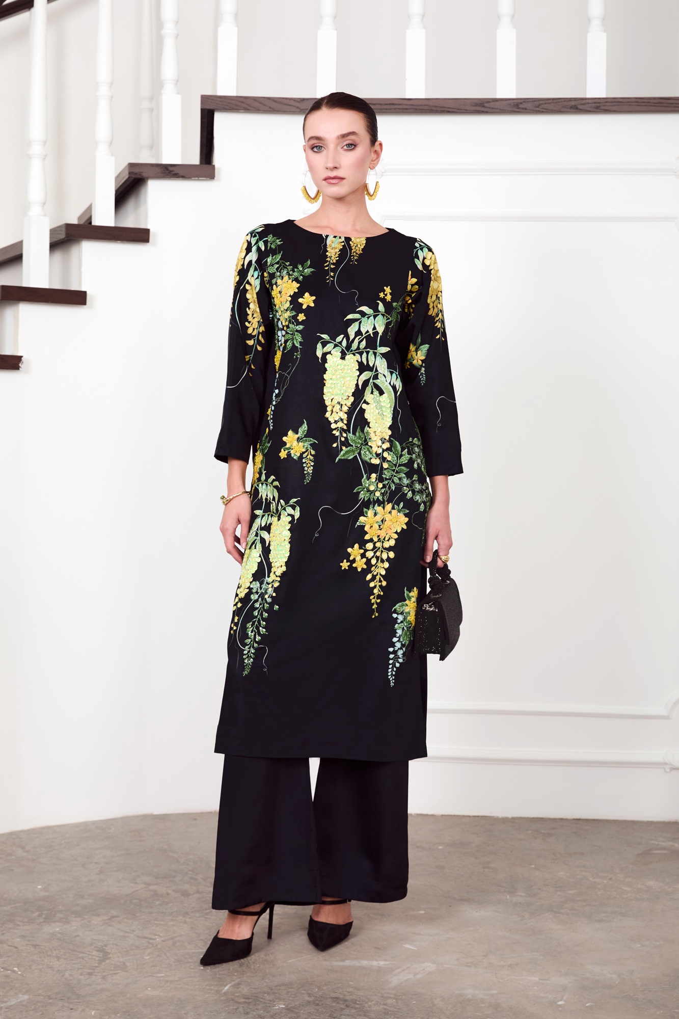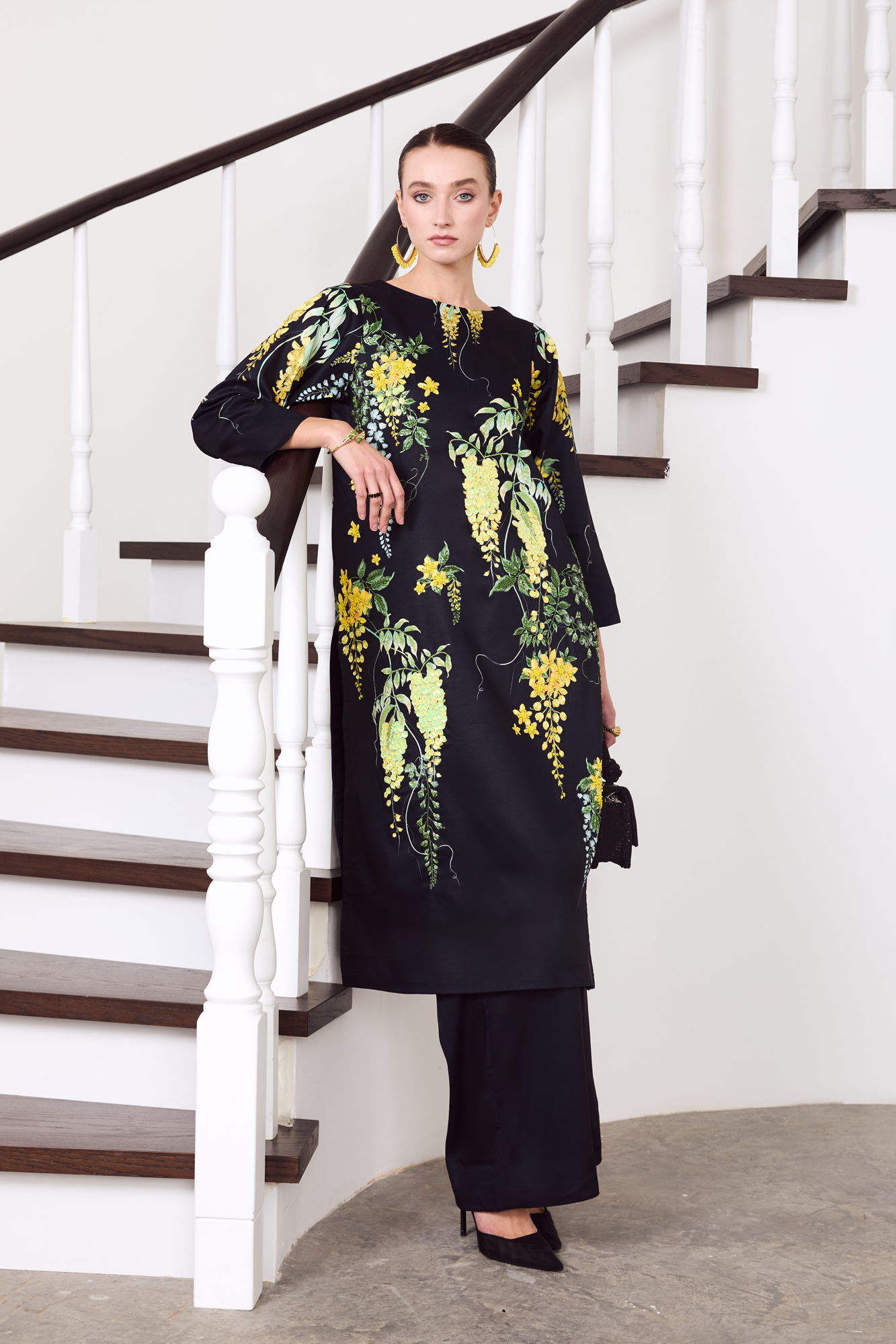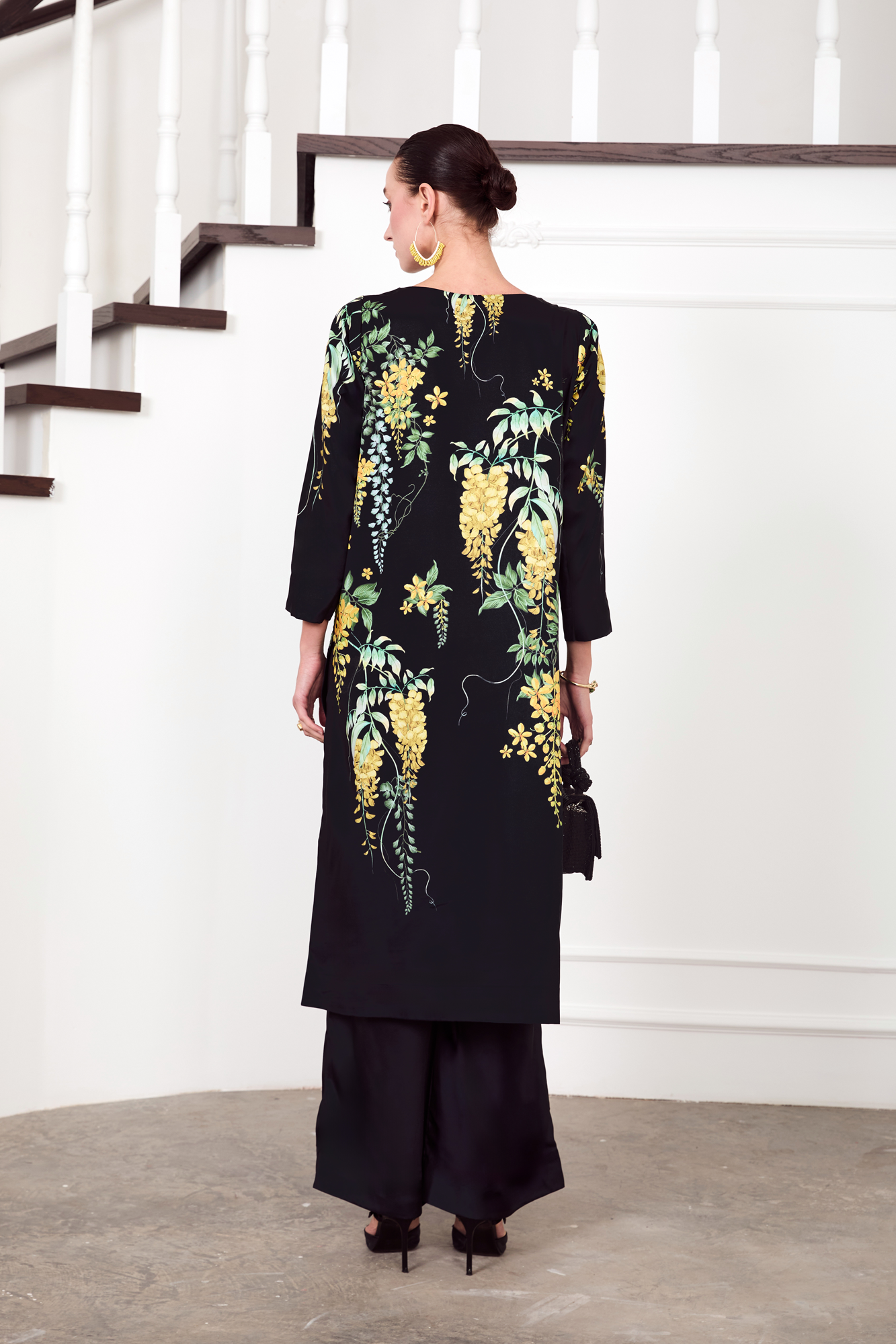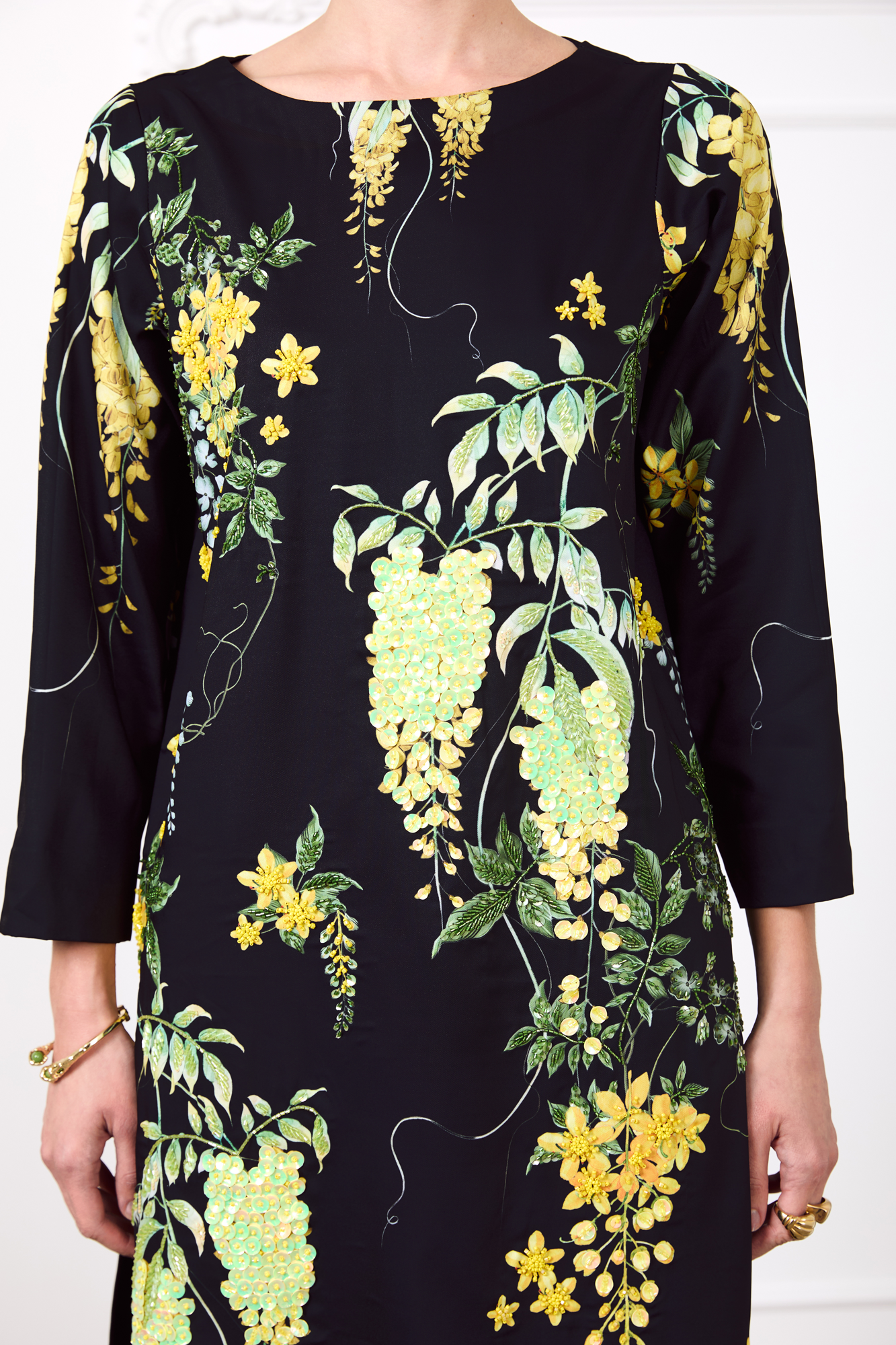 Midnight Bloom Ensemble Radiate timeless elegance in this Midnight Bloom Ensemble, featuring a rich Black base adorned with cascading floral motifs in vibrant shades of yellow and green. Crafted from luxurious Charmeuse Silk, it drapes beautifully, offering a subtle sheen and fluid silhouette that speaks of understated sophistication. Perfect for evening gatherings or festive occasions where grace meets modern charm.