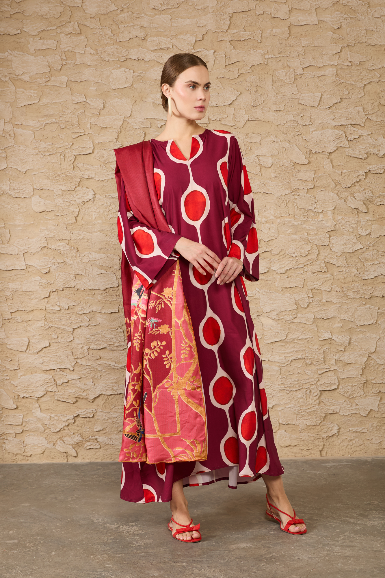 Embrace effortless grace with our Maroon & Crimson Geometric Soft Crepe Ensemble. Crafted from luxuriously soft crepe, this three-piece set features bold crimson and ivory patterns over a deep maroon base. Paired with an embroidered dupatta and matching trousers, it flows with elegance — a perfect harmony of comfort, artistry, and modern sophistication.