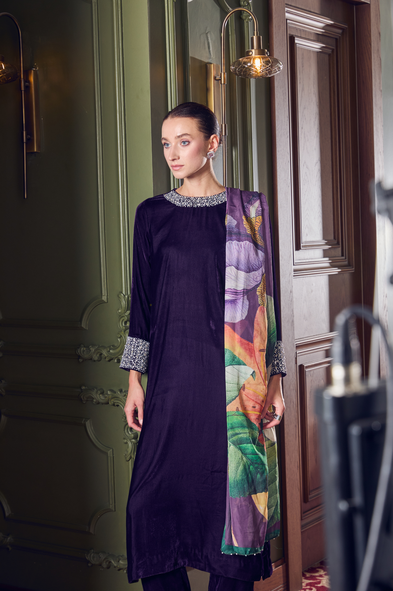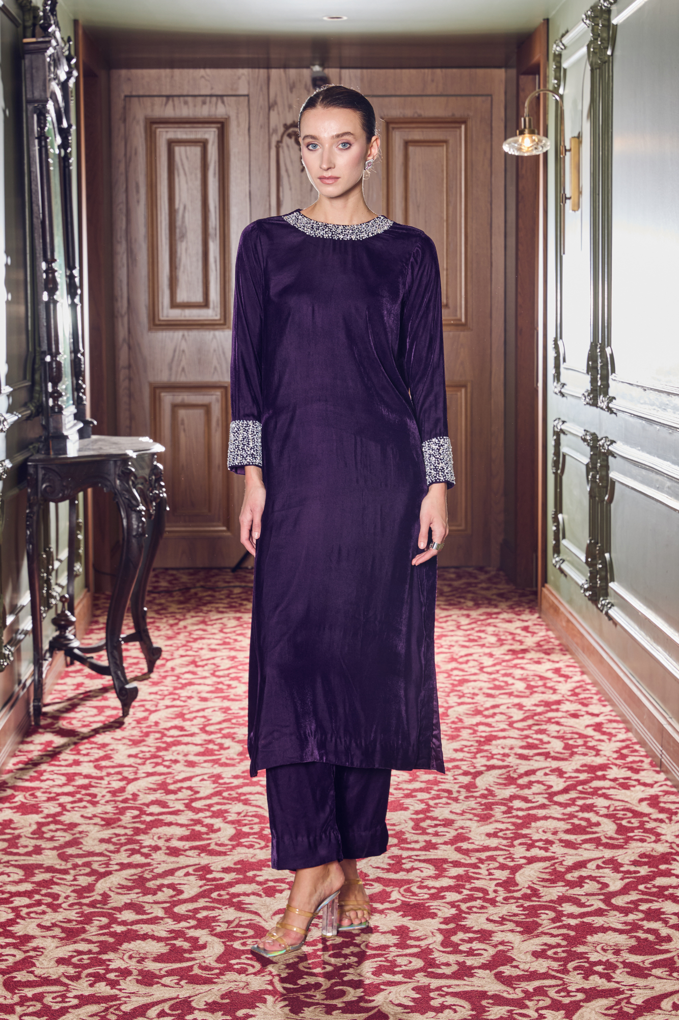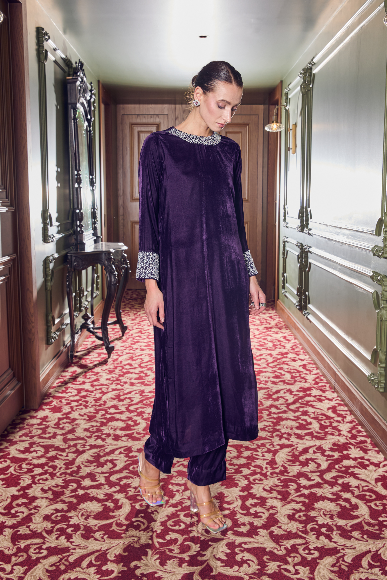 Radiate sophistication in this deep plum velvet ensemble, featuring exquisite hand embellishments on the neckline and cuffs. The delicate artistry adds a refined sparkle to the rich velvet base, making it ideal for festive evenings and formal occasions. Paired with matching pants for a graceful, timeless look.