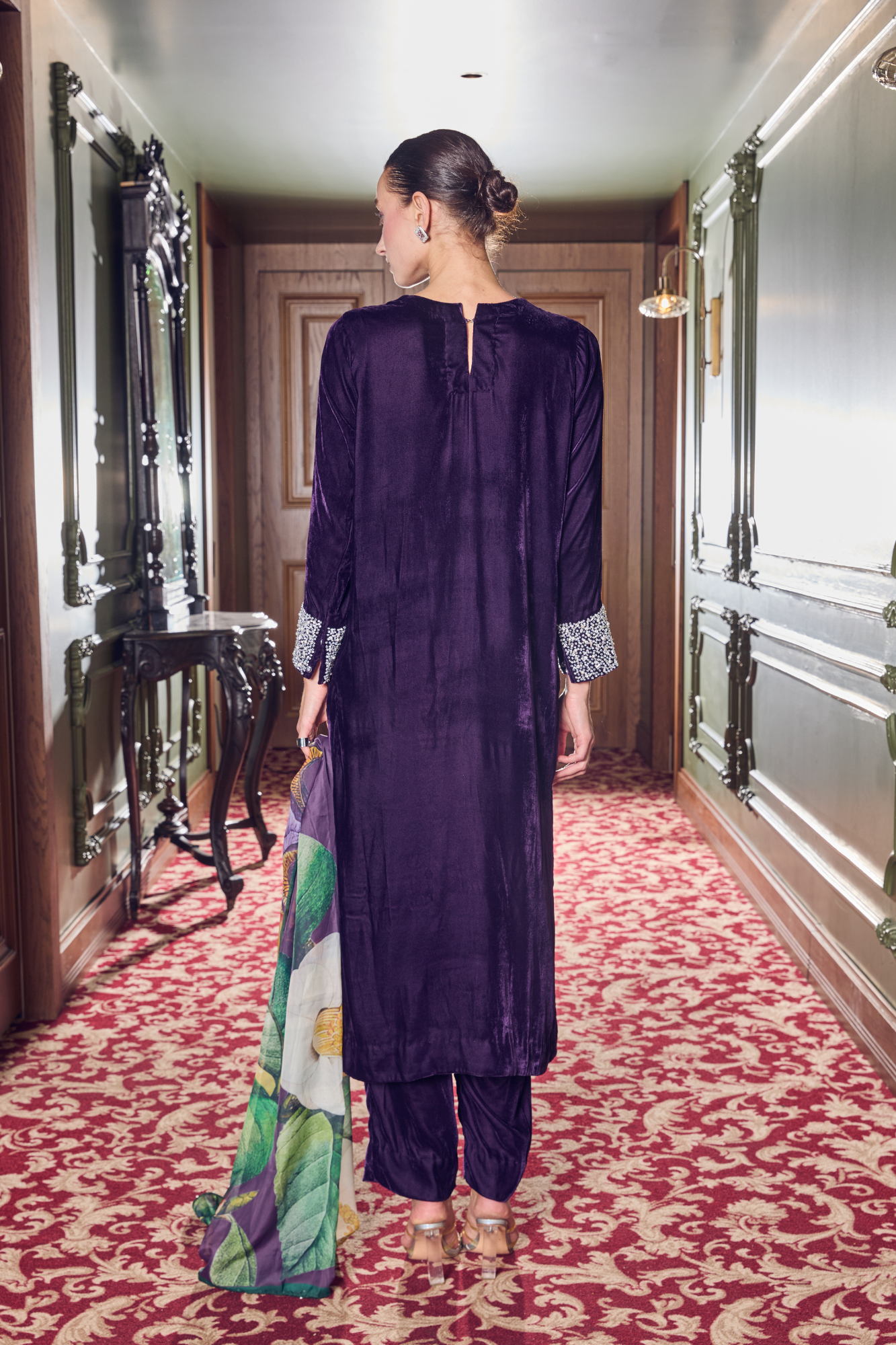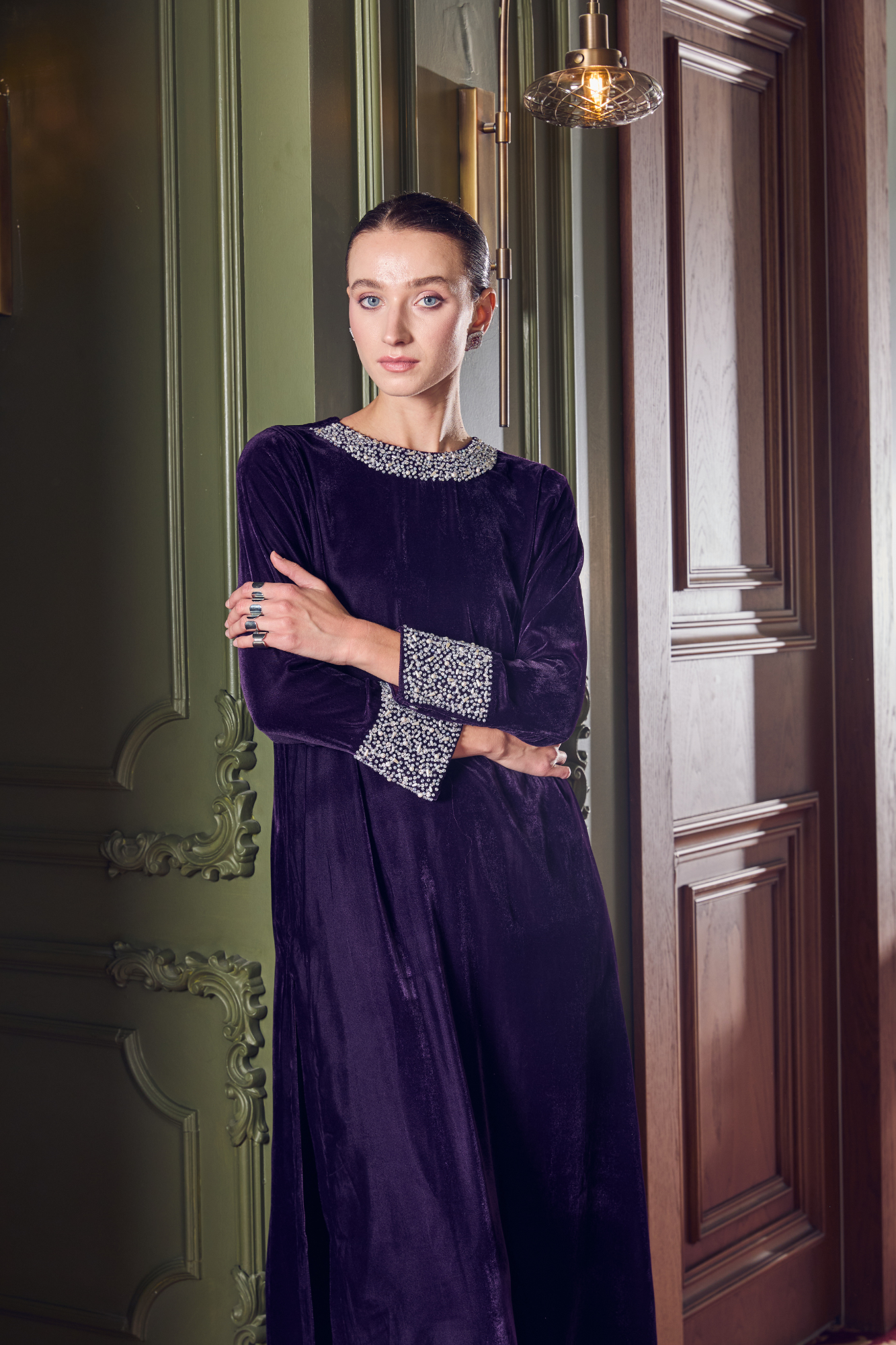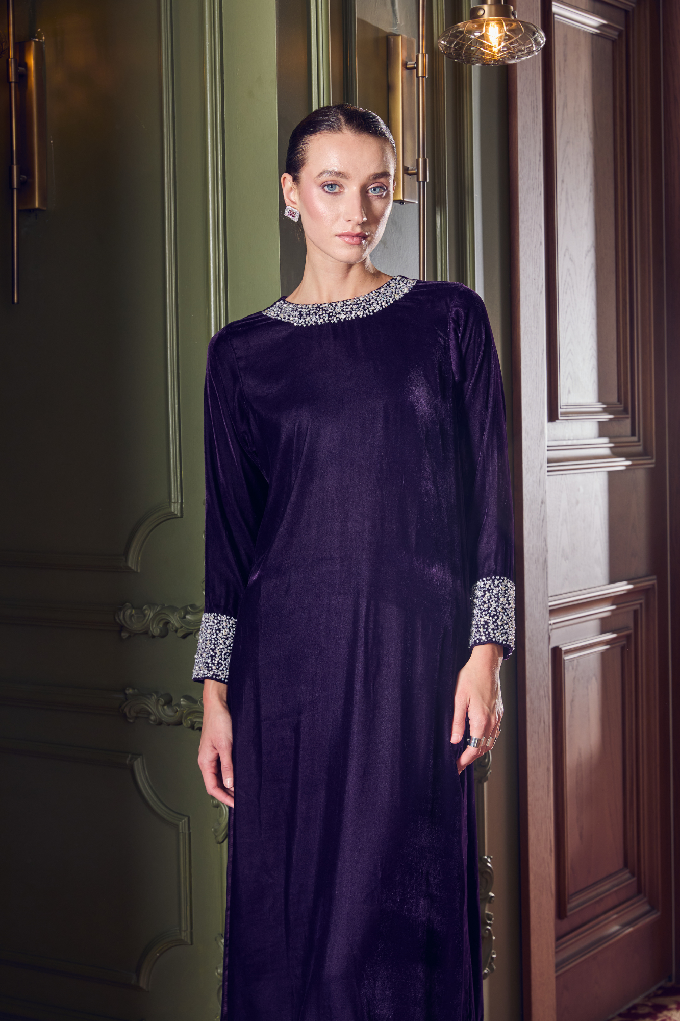 Radiate sophistication in this deep plum velvet ensemble, featuring exquisite hand embellishments on the neckline and cuffs. The delicate artistry adds a refined sparkle to the rich velvet base, making it ideal for festive evenings and formal occasions. Paired with matching pants for a graceful, timeless look.