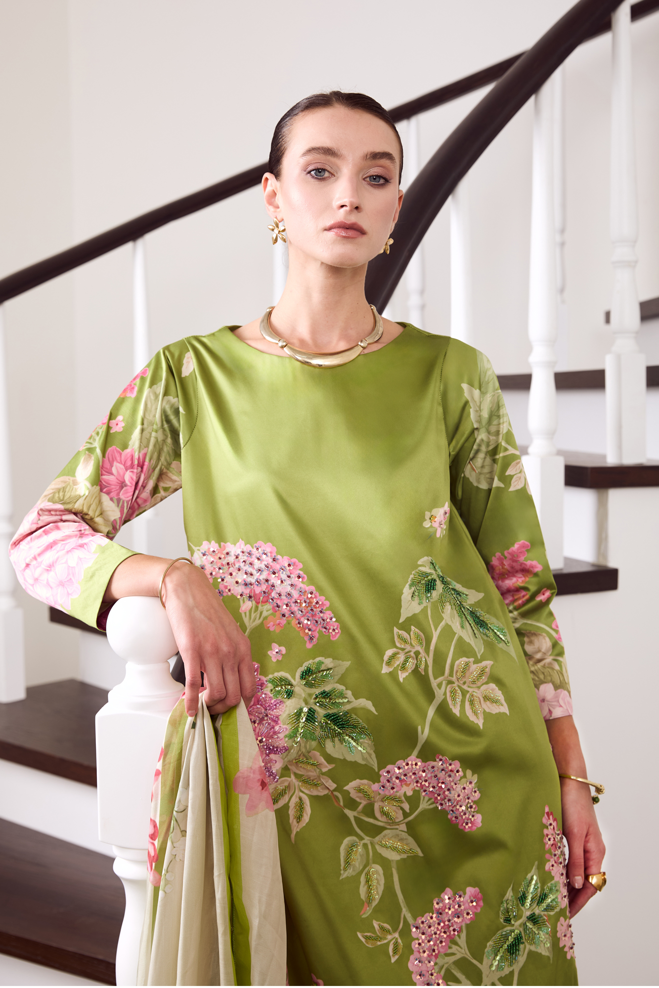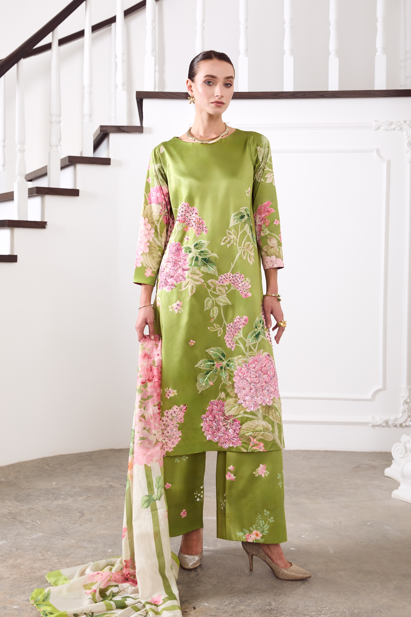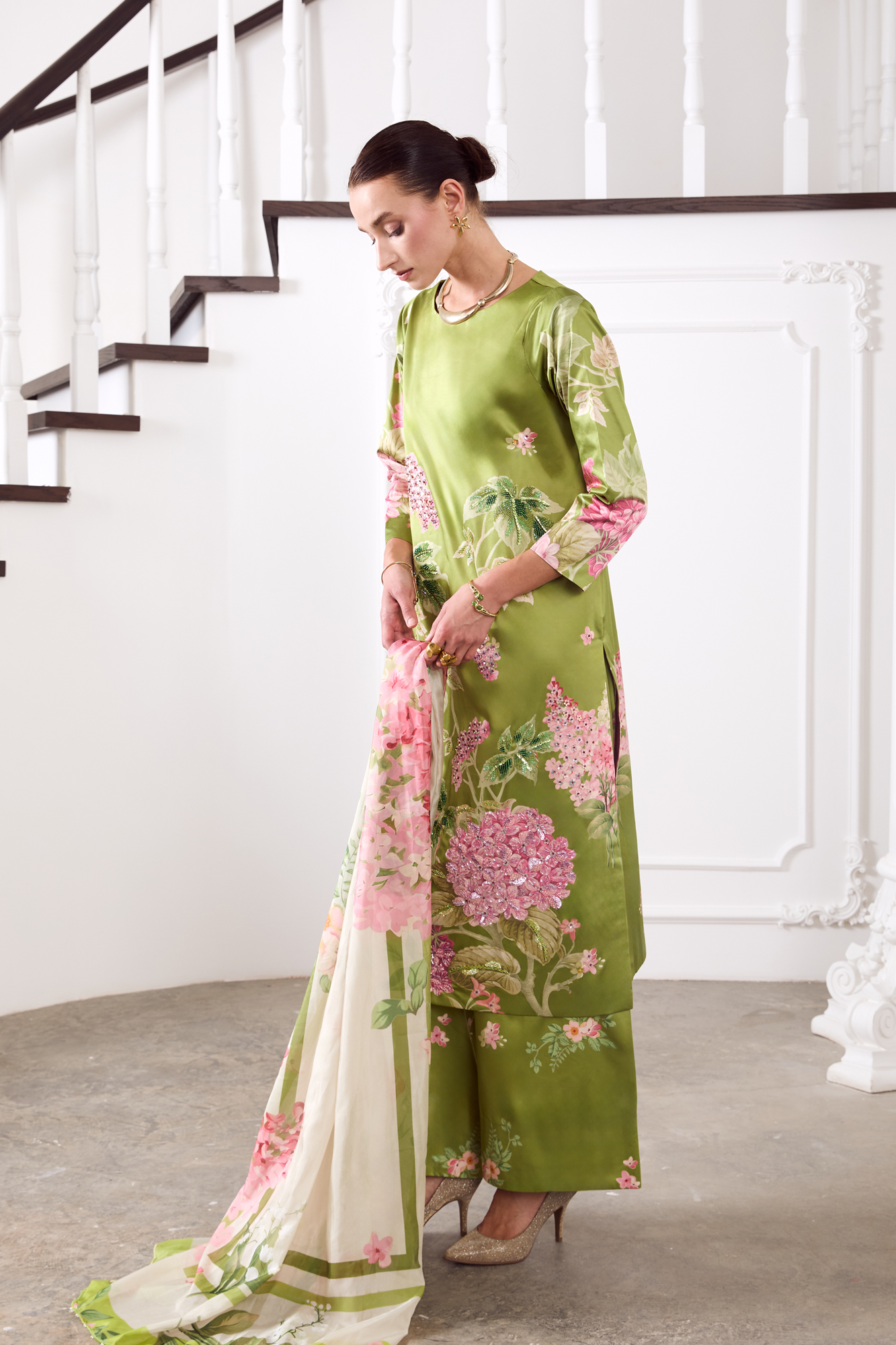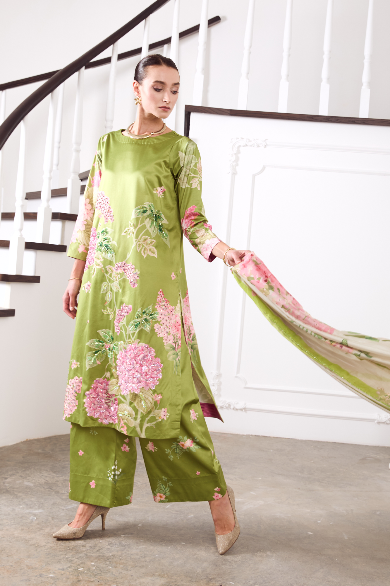 Step into timeless sophistication with this exquisite charmeuse silk ensemble, featuring a serene apple green hue beautifully complemented by blossoming pink floral motifs. The long, straight-cut kameez, adorned with intricate floral detailing, strikes a perfect balance of elegance and femininity. Paired with wide-leg trousers showcasing subtle scattered florals, the outfit flows gracefully with every movement, highlighting the luxurious sheen and fluid drape characteristic of fine charmeuse silk. Perfect for festive occasions, formal gatherings, or elegant soirées, this ensemble embodies effortless, understated glamour.