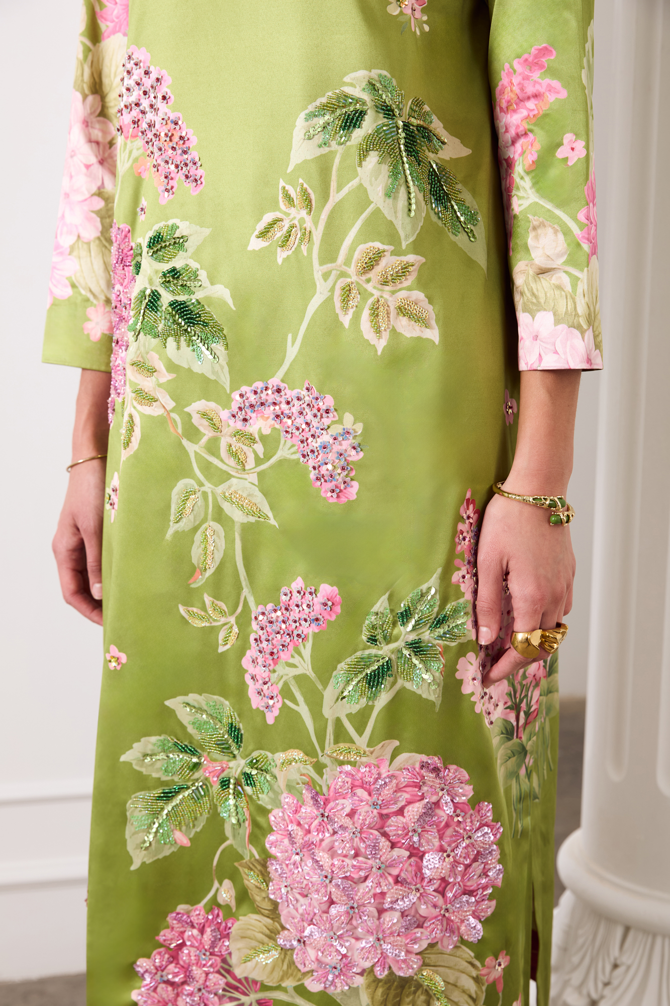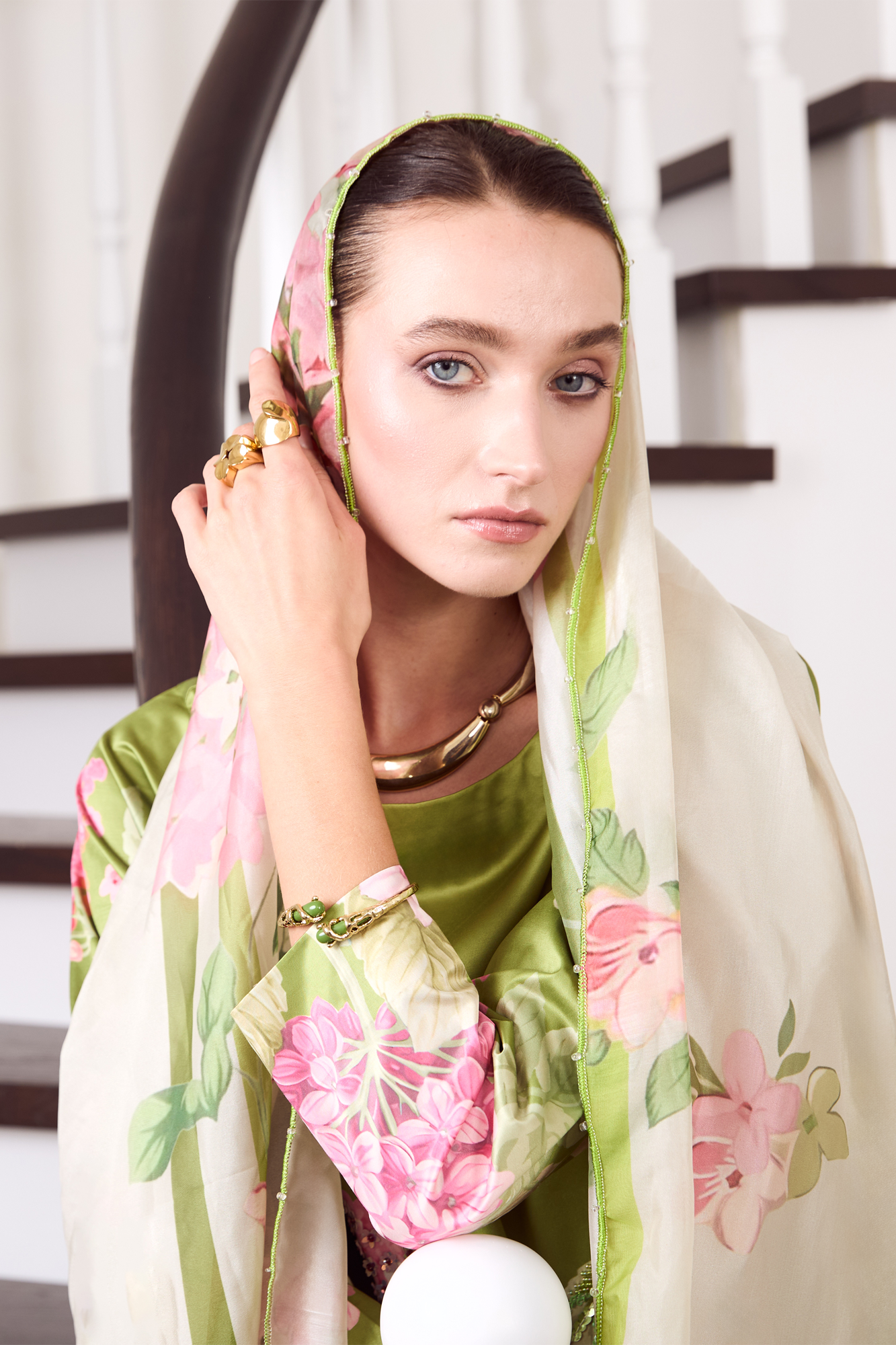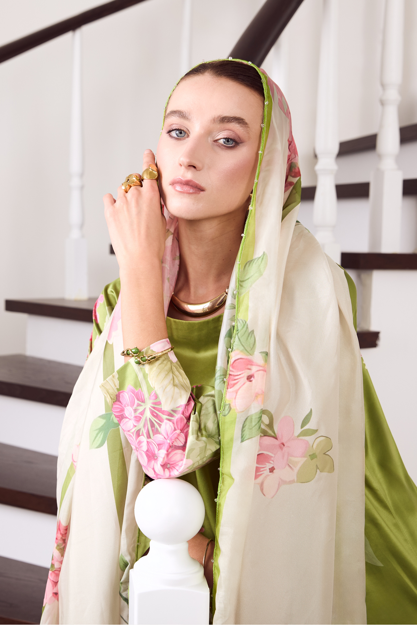 Step into timeless sophistication with this exquisite charmeuse silk ensemble, featuring a serene apple green hue beautifully complemented by blossoming pink floral motifs. The long, straight-cut kameez, adorned with intricate floral detailing, strikes a perfect balance of elegance and femininity. Paired with wide-leg trousers showcasing subtle scattered florals, the outfit flows gracefully with every movement, highlighting the luxurious sheen and fluid drape characteristic of fine charmeuse silk. Perfect for festive occasions, formal gatherings, or elegant soirées, this ensemble embodies effortless, understated glamour.