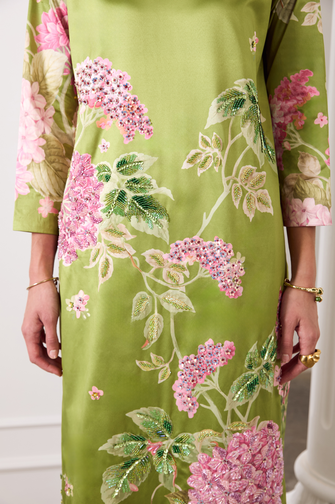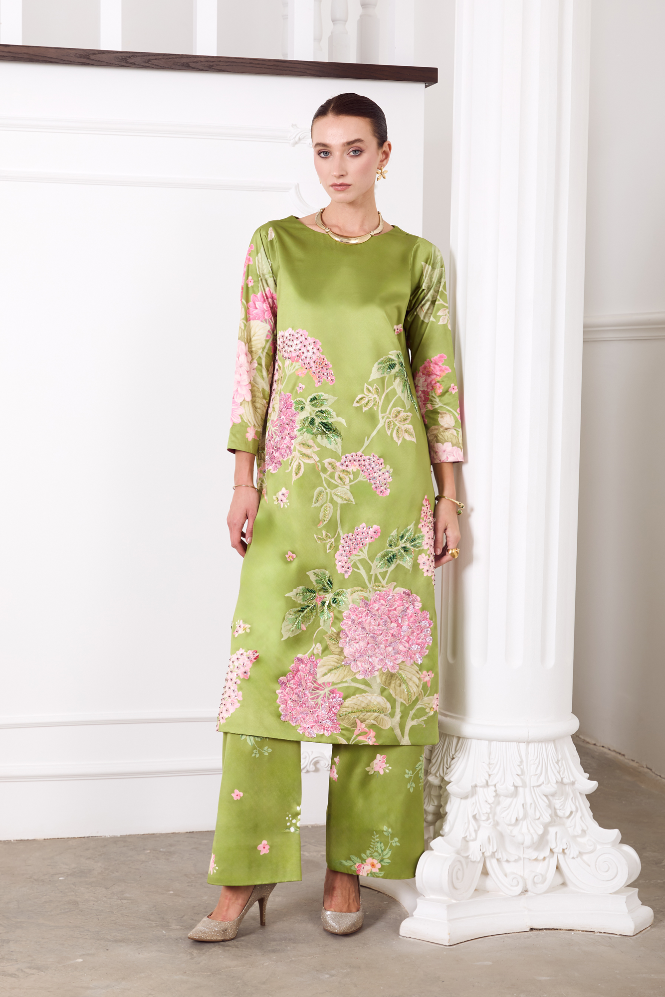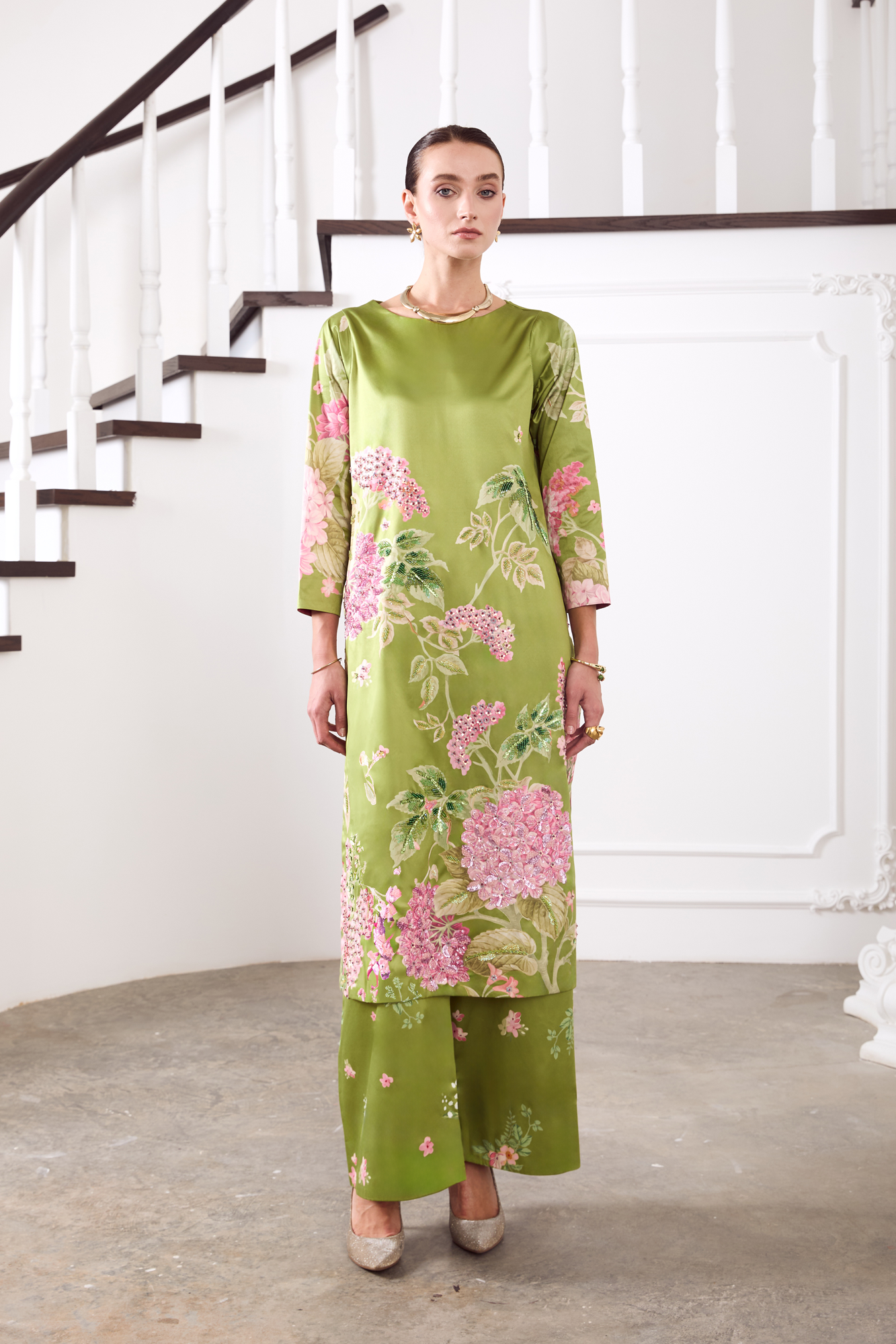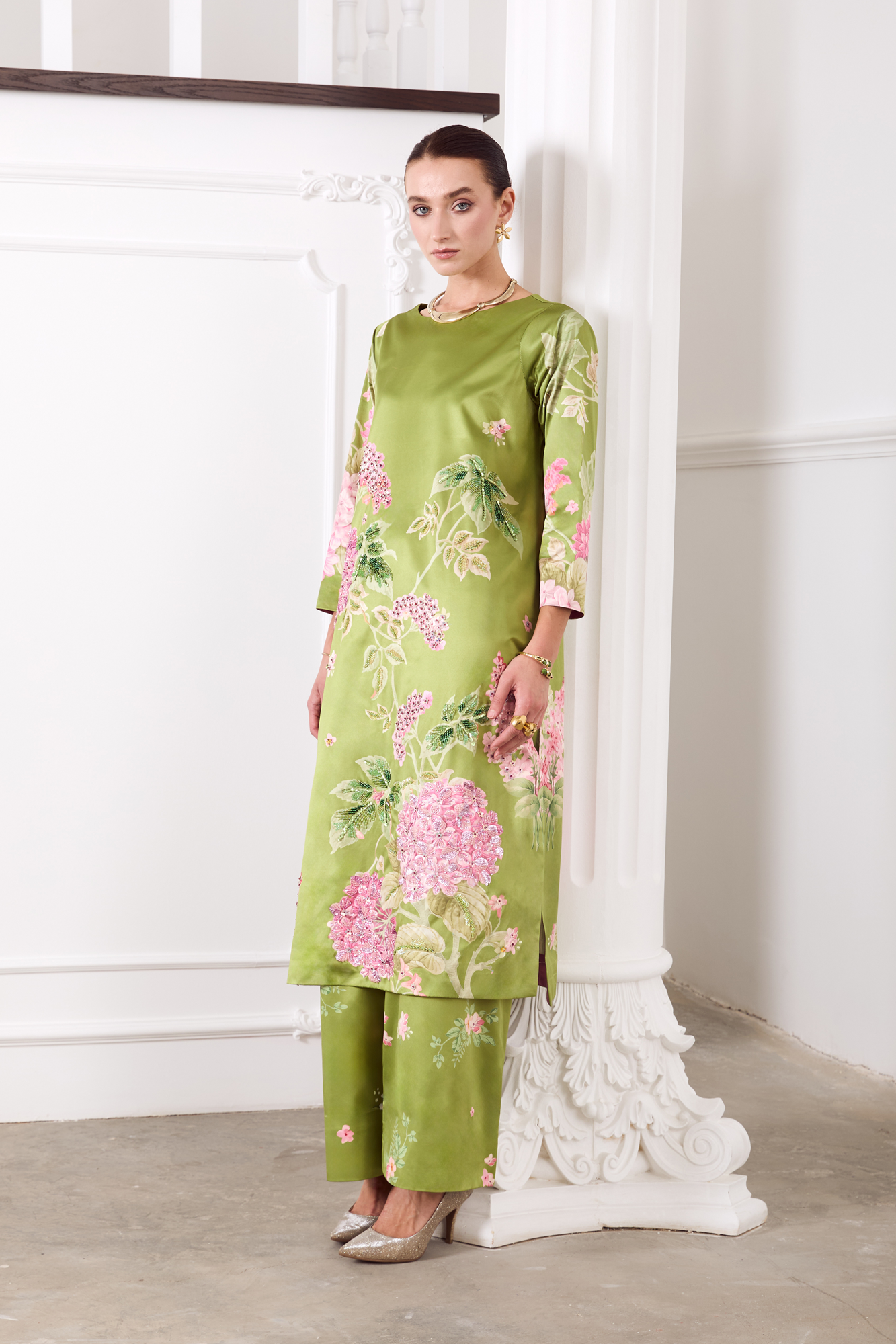 Step into timeless sophistication with this exquisite charmeuse silk ensemble, featuring a serene apple green hue beautifully complemented by blossoming pink floral motifs. The long, straight-cut kameez, adorned with intricate floral detailing, strikes a perfect balance of elegance and femininity. Paired with wide-leg trousers showcasing subtle scattered florals, the outfit flows gracefully with every movement, highlighting the luxurious sheen and fluid drape characteristic of fine charmeuse silk. Perfect for festive occasions, formal gatherings, or elegant soirées, this ensemble embodies effortless, understated glamour.