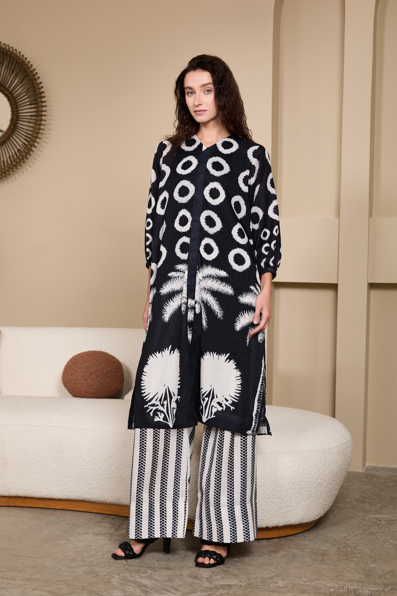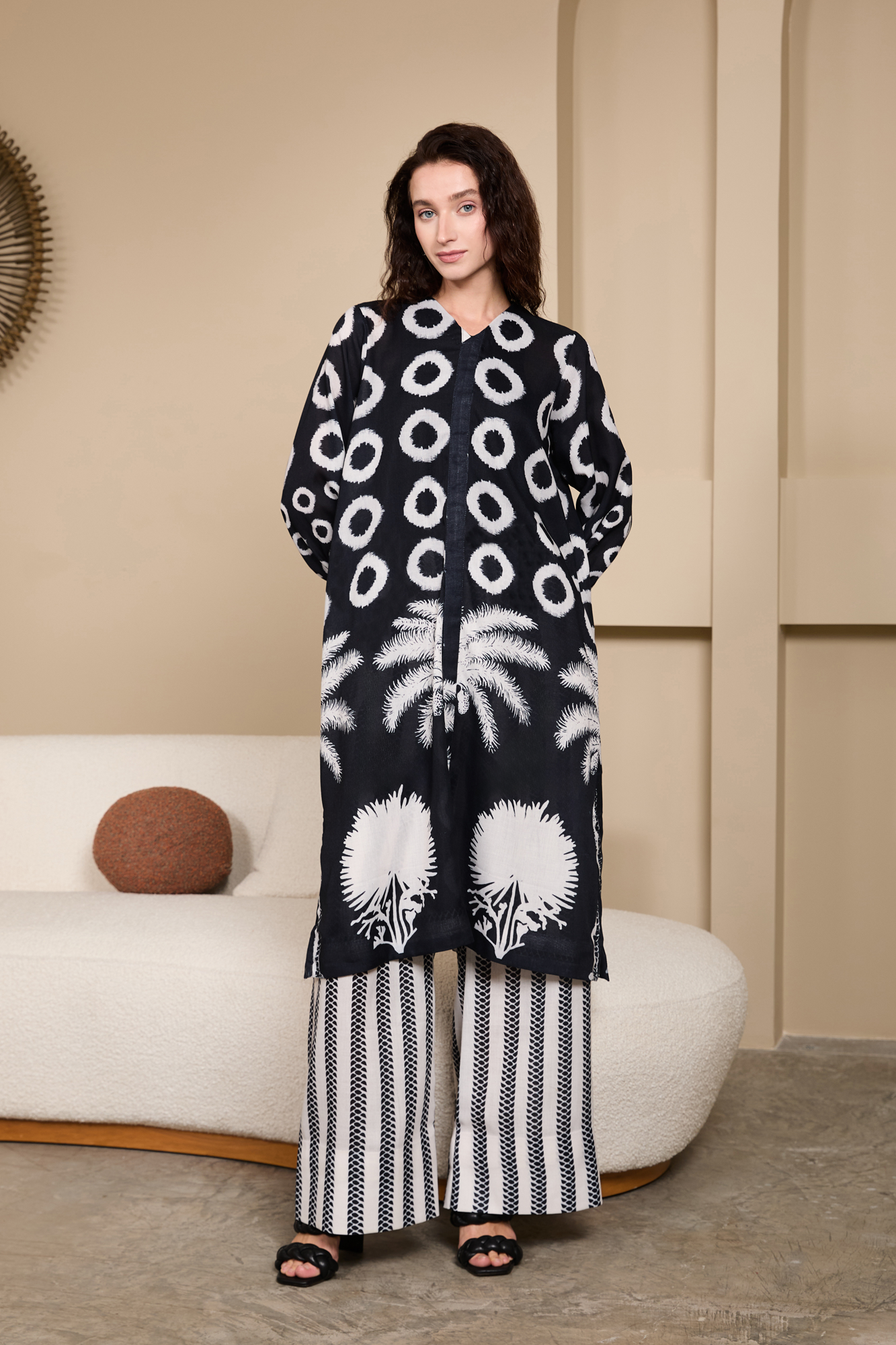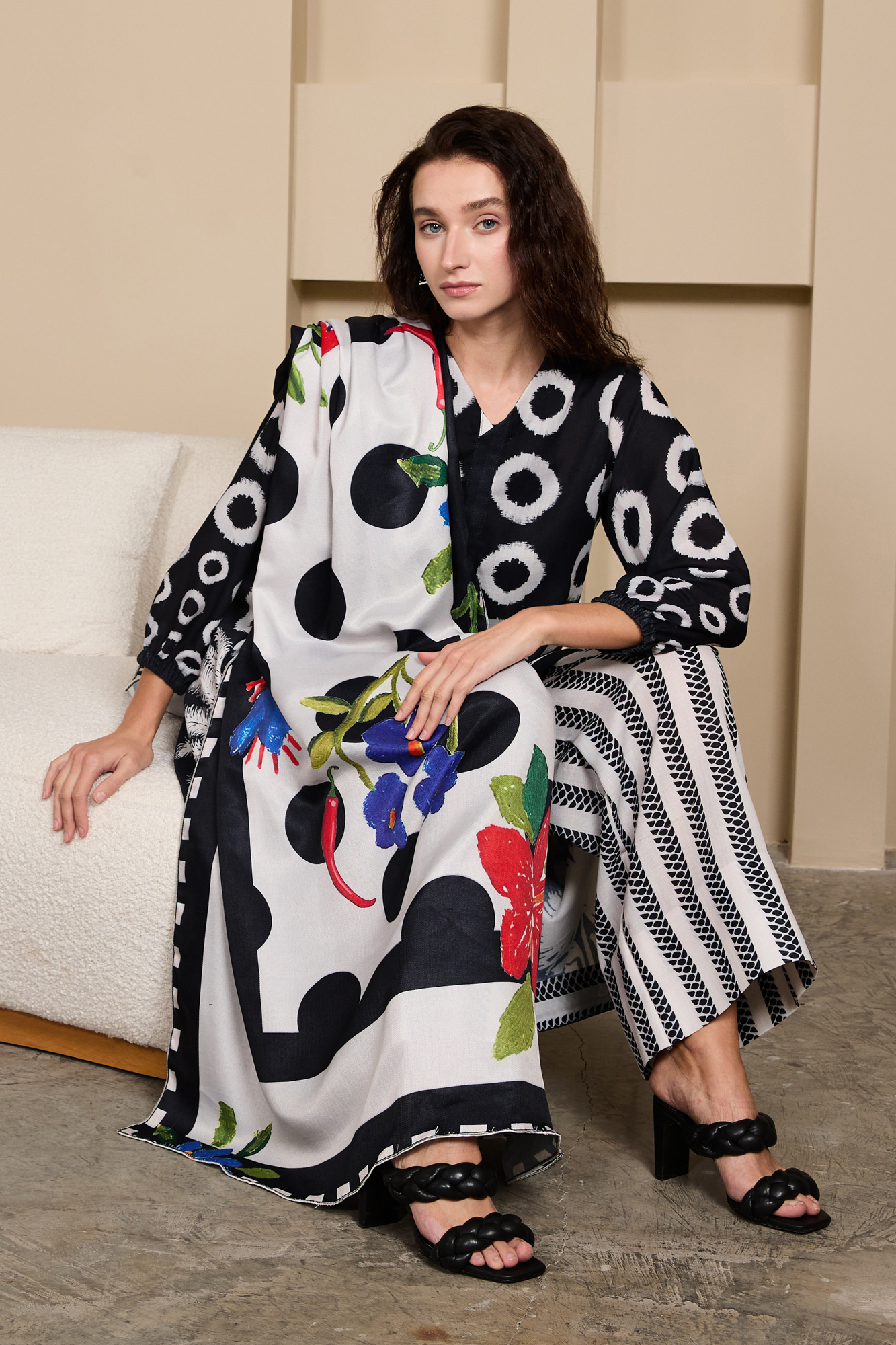 Redefine modern elegance with our Black & White Artistic Khaddar Ensemble. Impeccably crafted from soft winter Khaddar, this three-piece masterpiece captivates with its bold interplay of monochrome patterns and vibrant floral artistry. The shirt’s striking polka and circular motifs exude contemporary charm, while the vivid bursts of red, blue, and green embroidery-inspired prints add an avant-garde touch. Paired with chic patterned trousers and a statement printed dupatta, this ensemble celebrates individuality, confidence, and refined sophistication. Perfect for the woman who embraces art and fashion in equal measure.