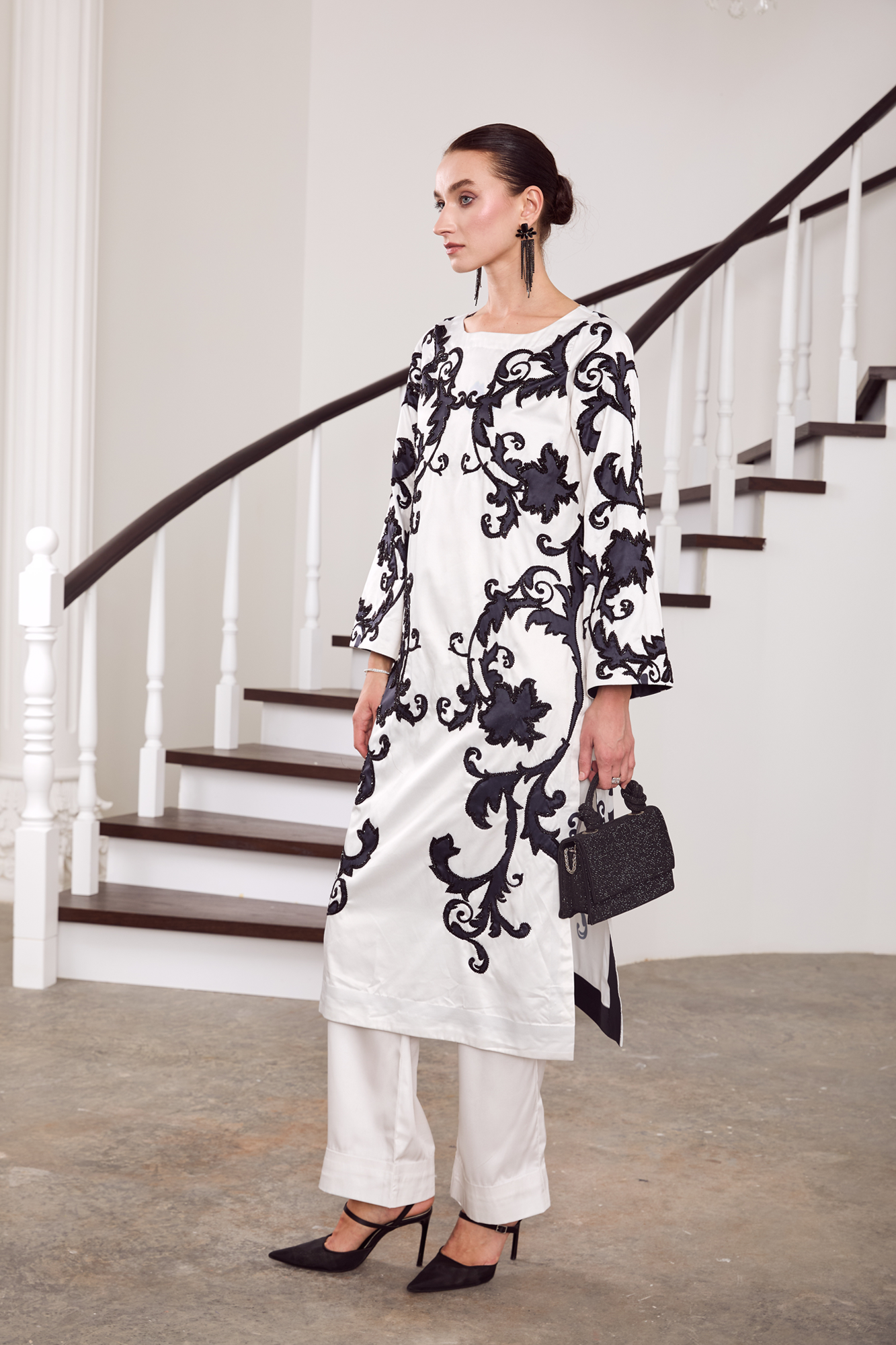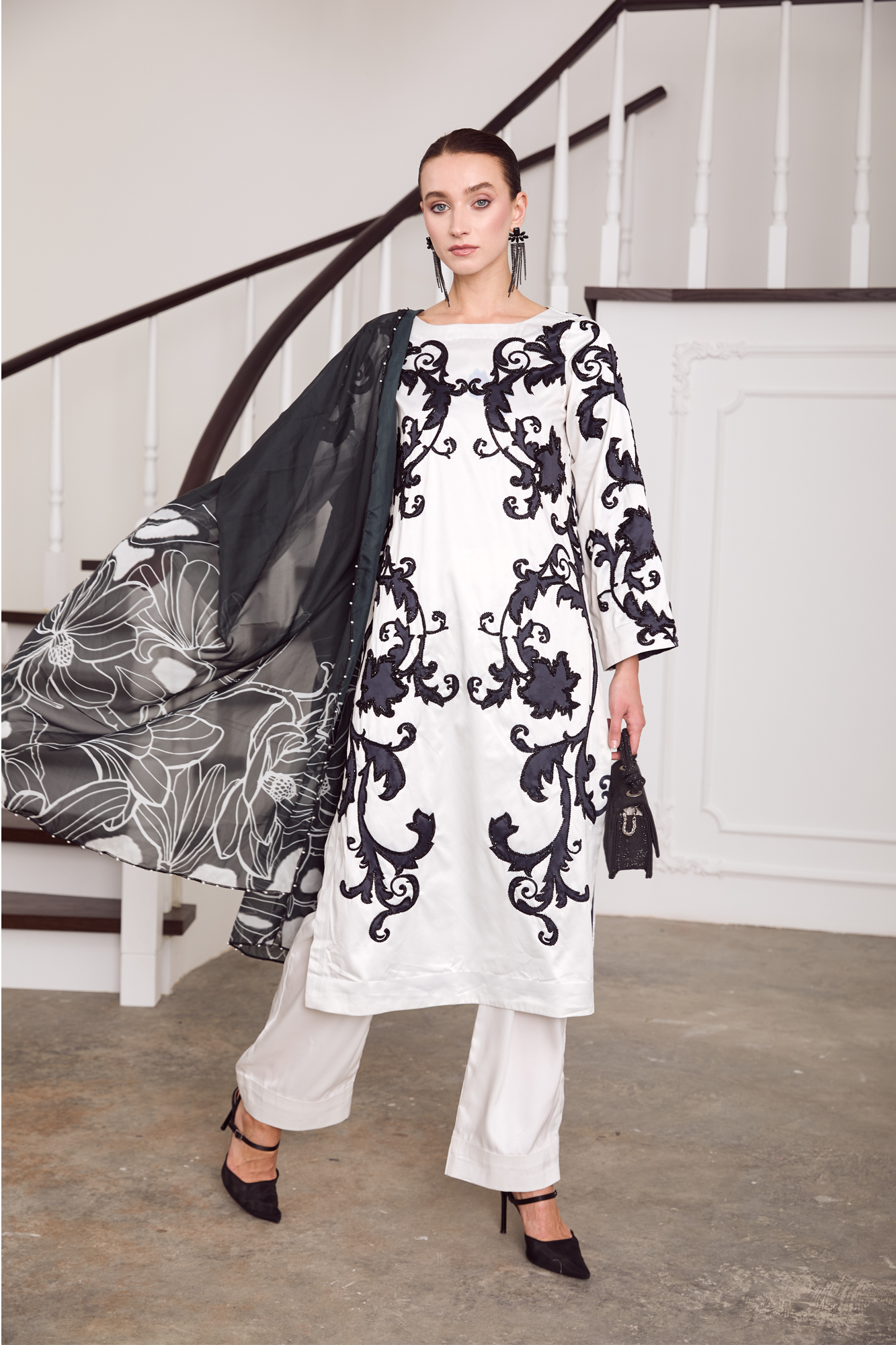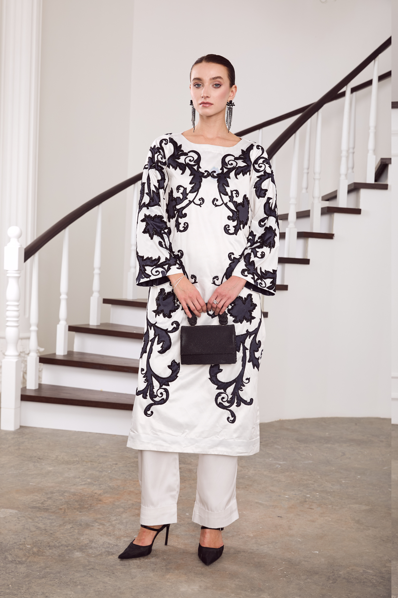 Ivory & Midnight Charmeuse Silk Ensemble Make an unforgettable impression in this exquisite charmeuse silk creation. The ivory canvas is beautifully elevated with intricate midnight embellishment, inspired by classic baroque artistry. Designed in a sleek straight-cut silhouette with refined ivory trousers, this ensemble exudes timeless grace and contemporary sophistication. Perfect for formal soirées or festive celebrations, it captures the essence of modern luxury with every detail.