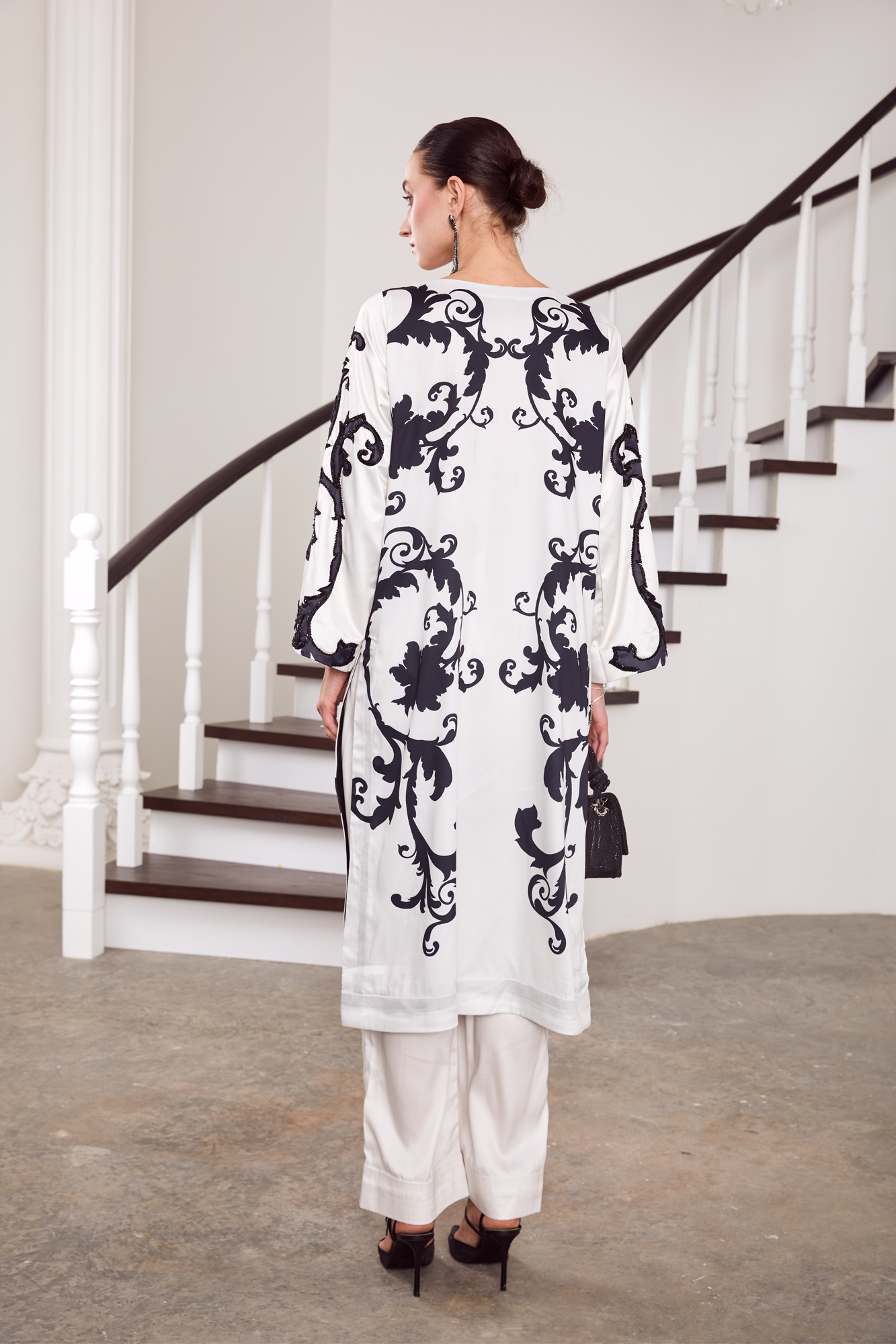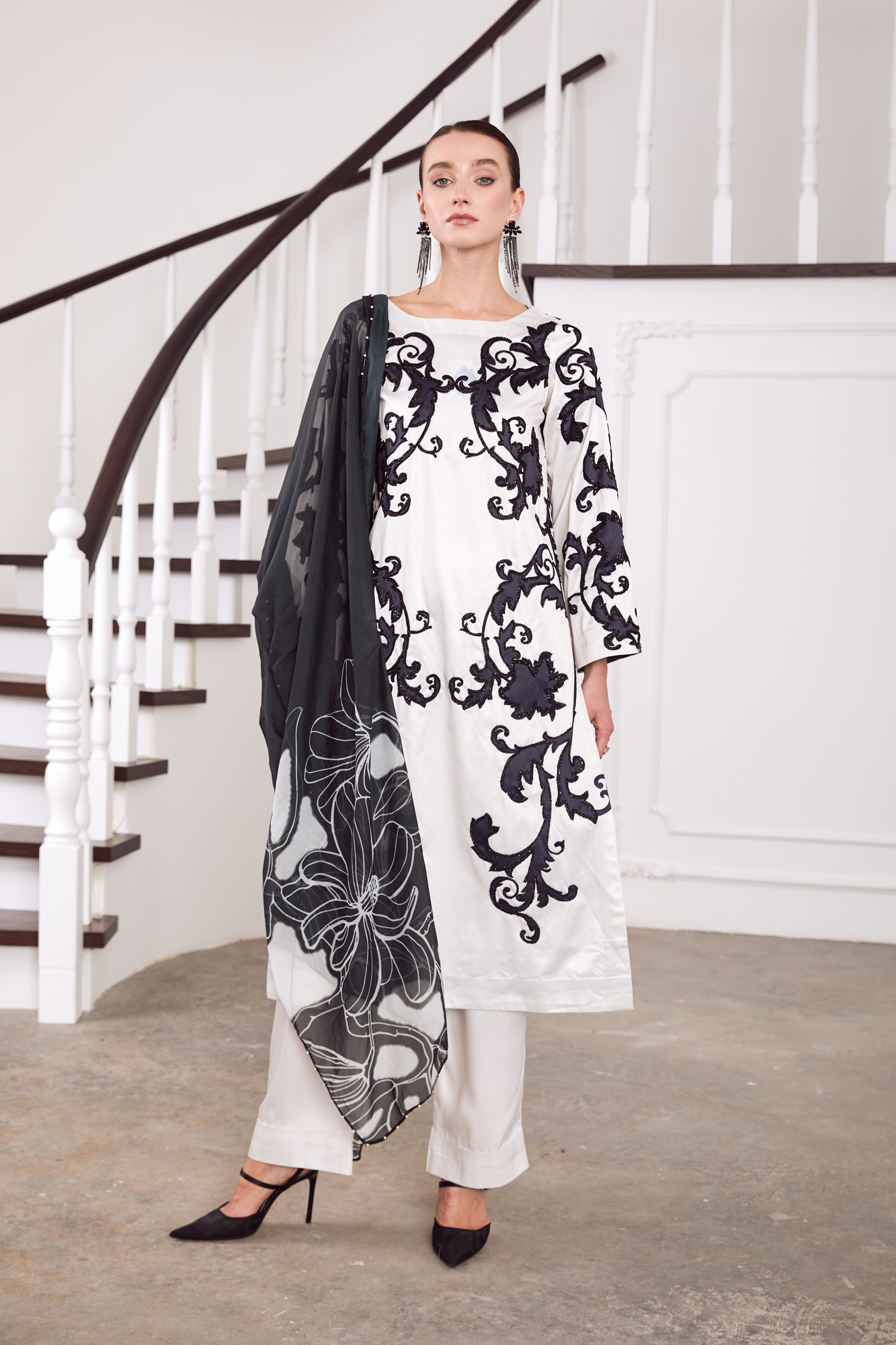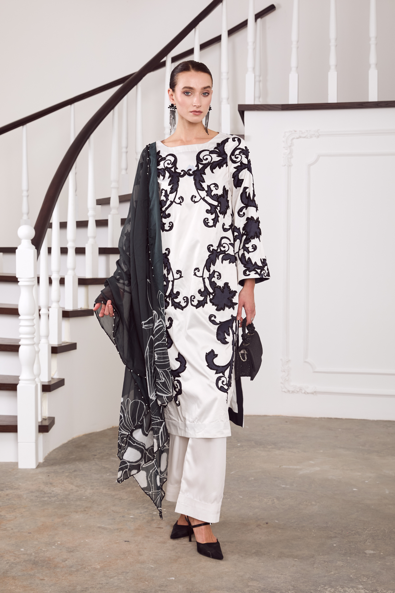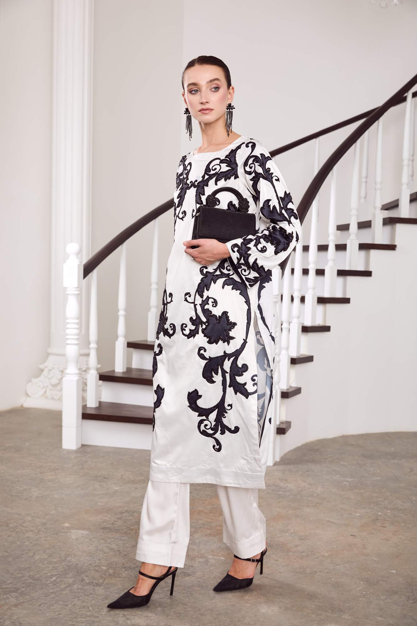 Ivory & Midnight Charmeuse Silk Ensemble Make an unforgettable impression in this exquisite charmeuse silk creation. The ivory canvas is beautifully elevated with intricate midnight embellishment, inspired by classic baroque artistry. Designed in a sleek straight-cut silhouette with refined ivory trousers, this ensemble exudes timeless grace and contemporary sophistication. Perfect for formal soirées or festive celebrations, it captures the essence of modern luxury with every detail.