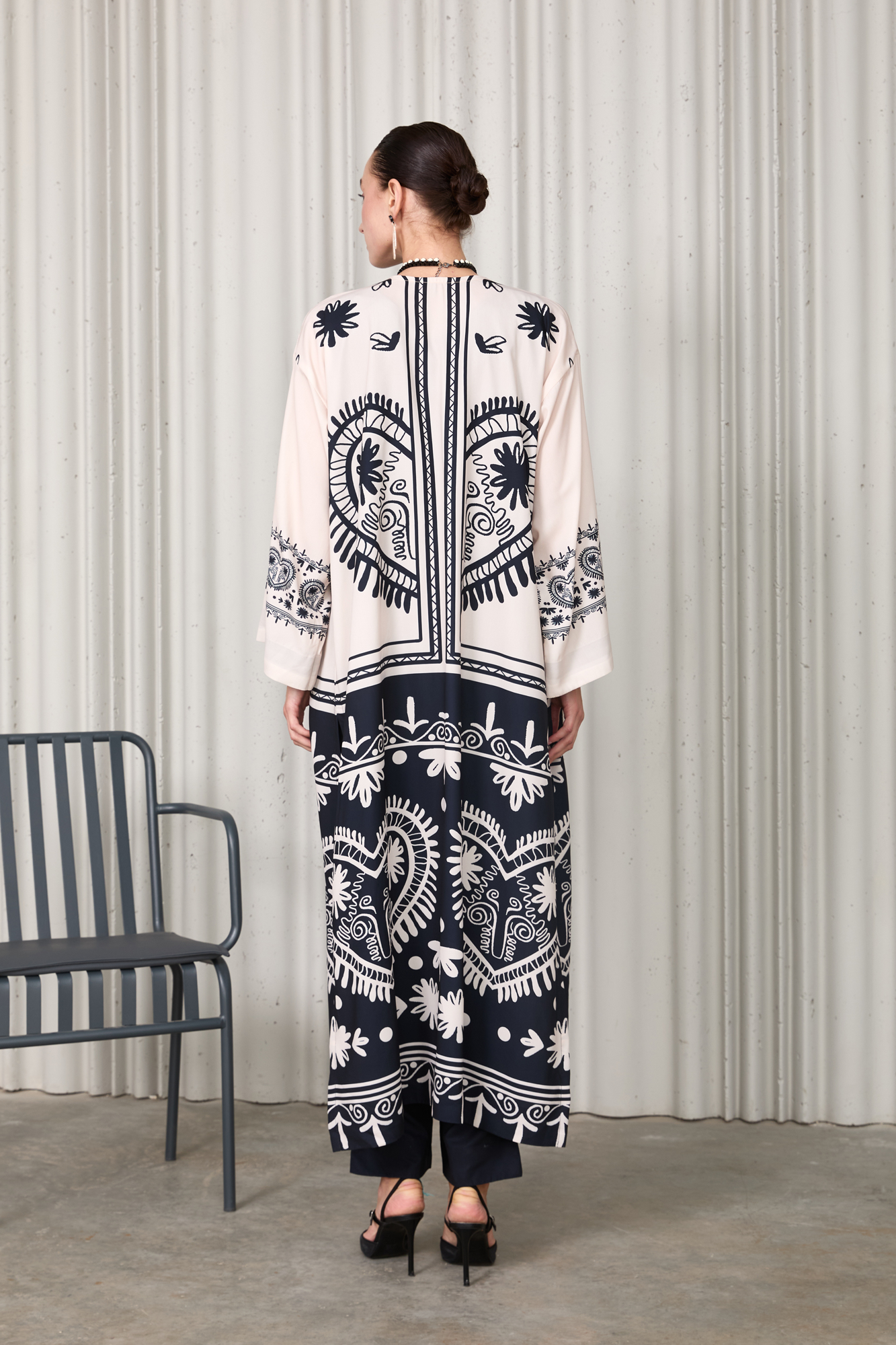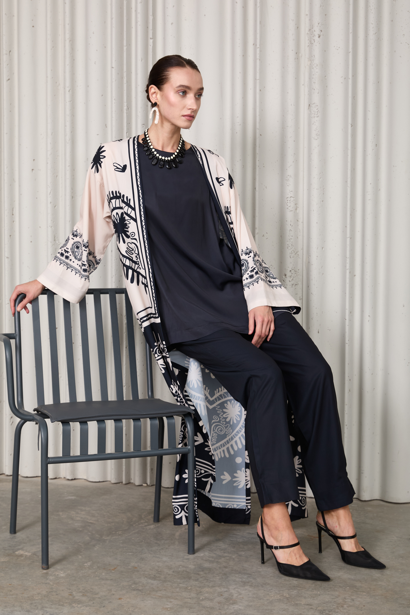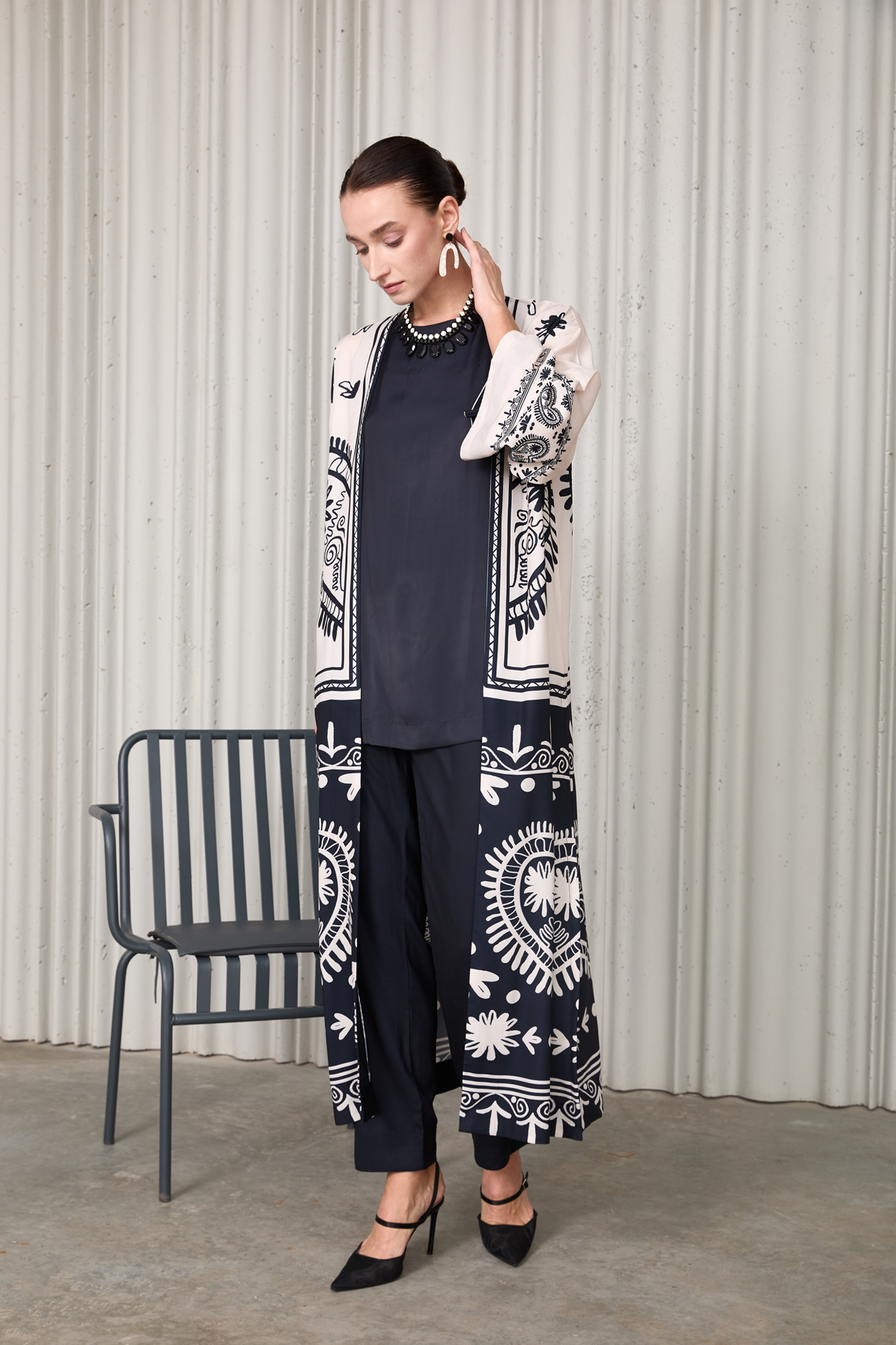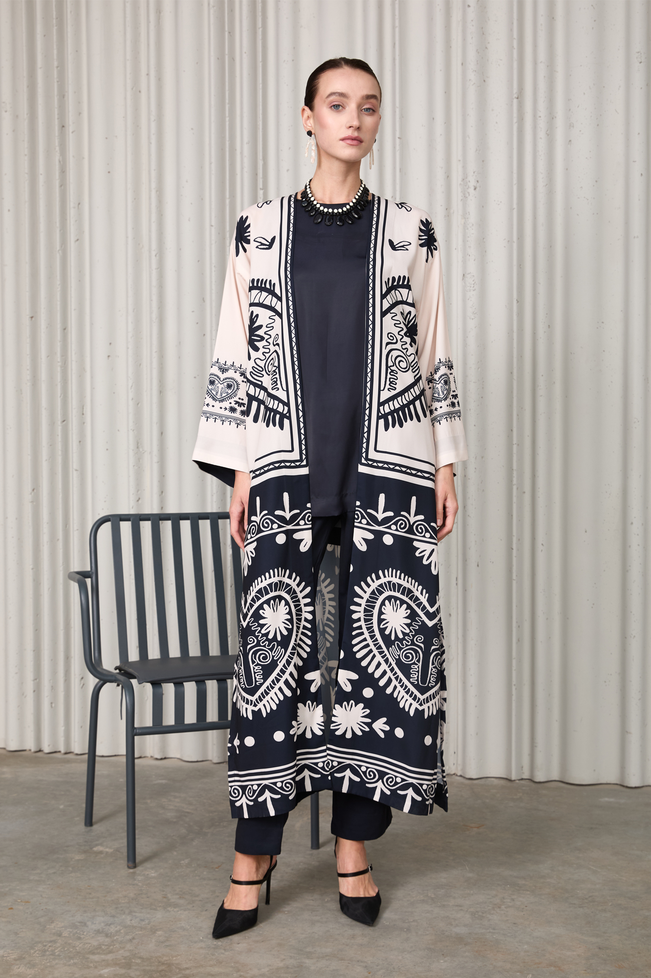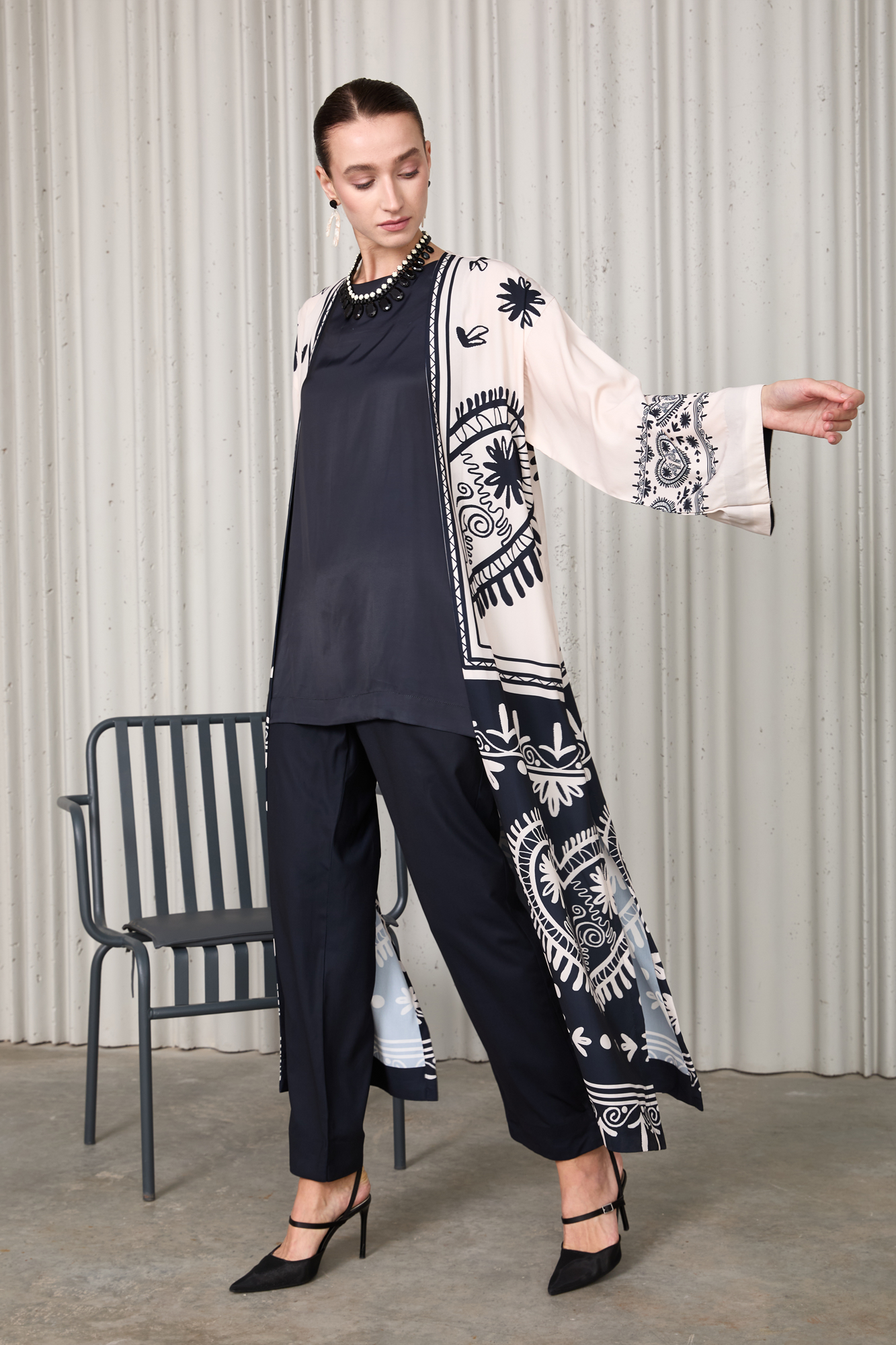 Elegant 3-piece set crafted from premium Soft Crepe fabric. Features a black and ivory printed long jacket, paired with a solid inner shirt and straight pants. Lightweight, breathable, and effortlessly chic — perfect for festive, semi-formal, or evening wear.