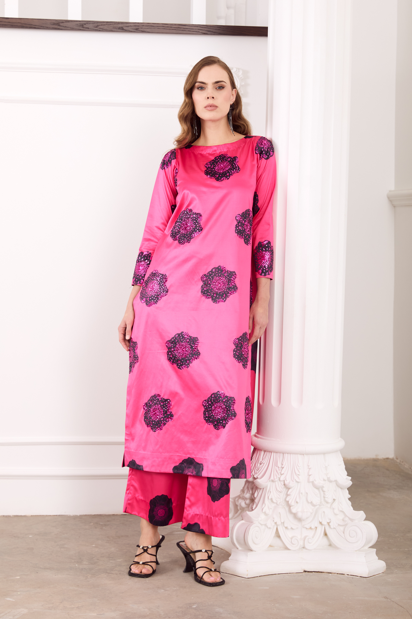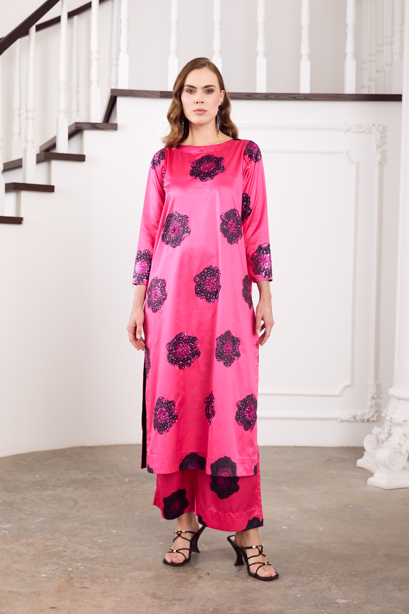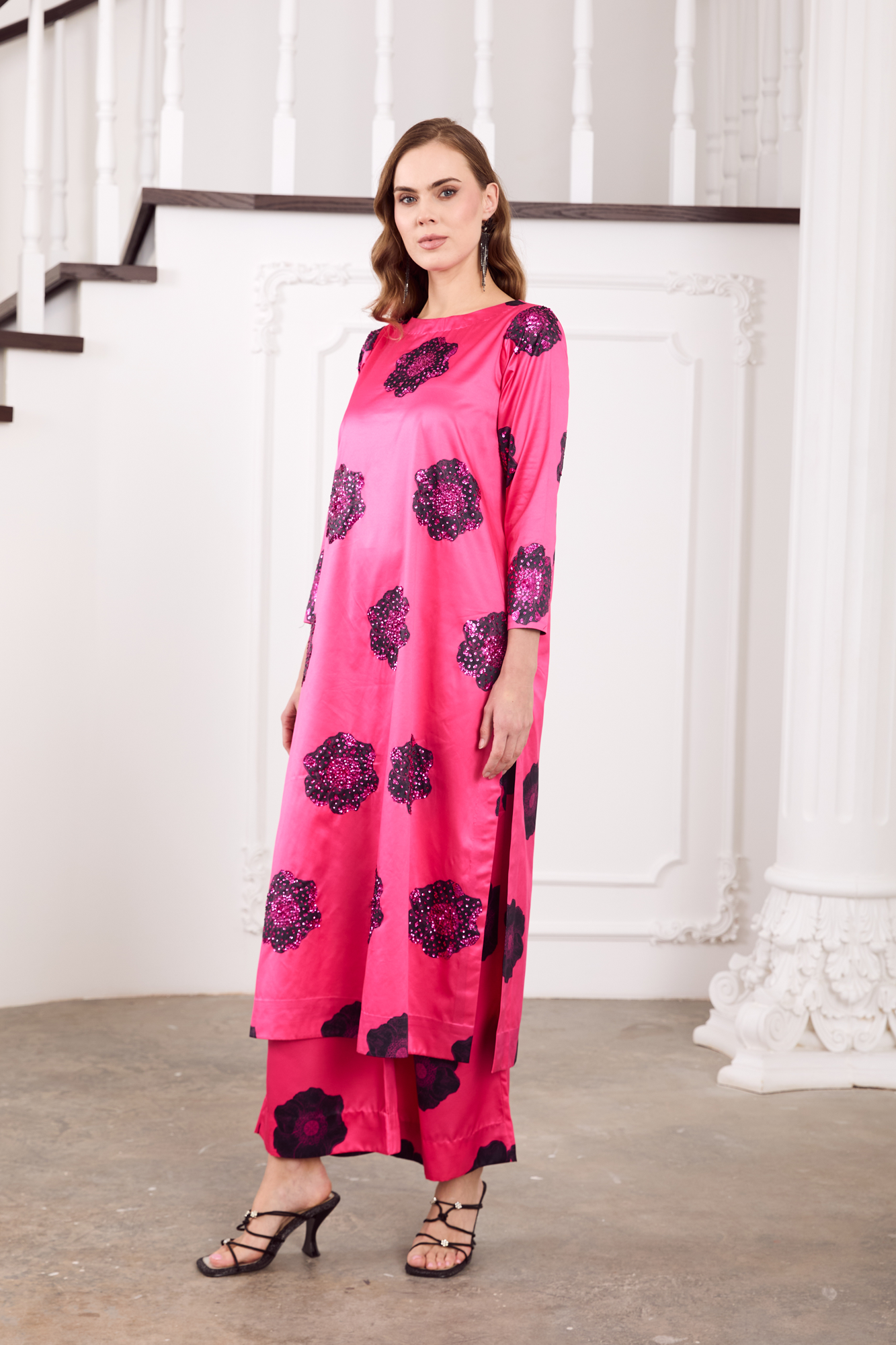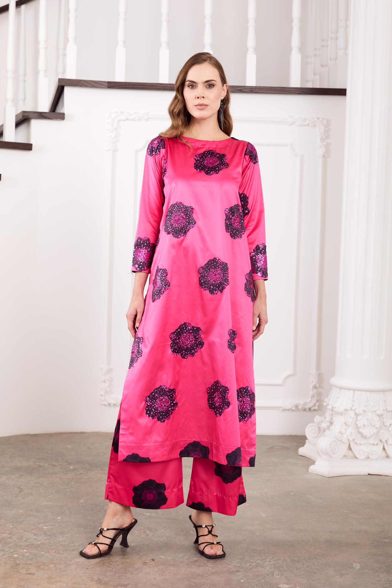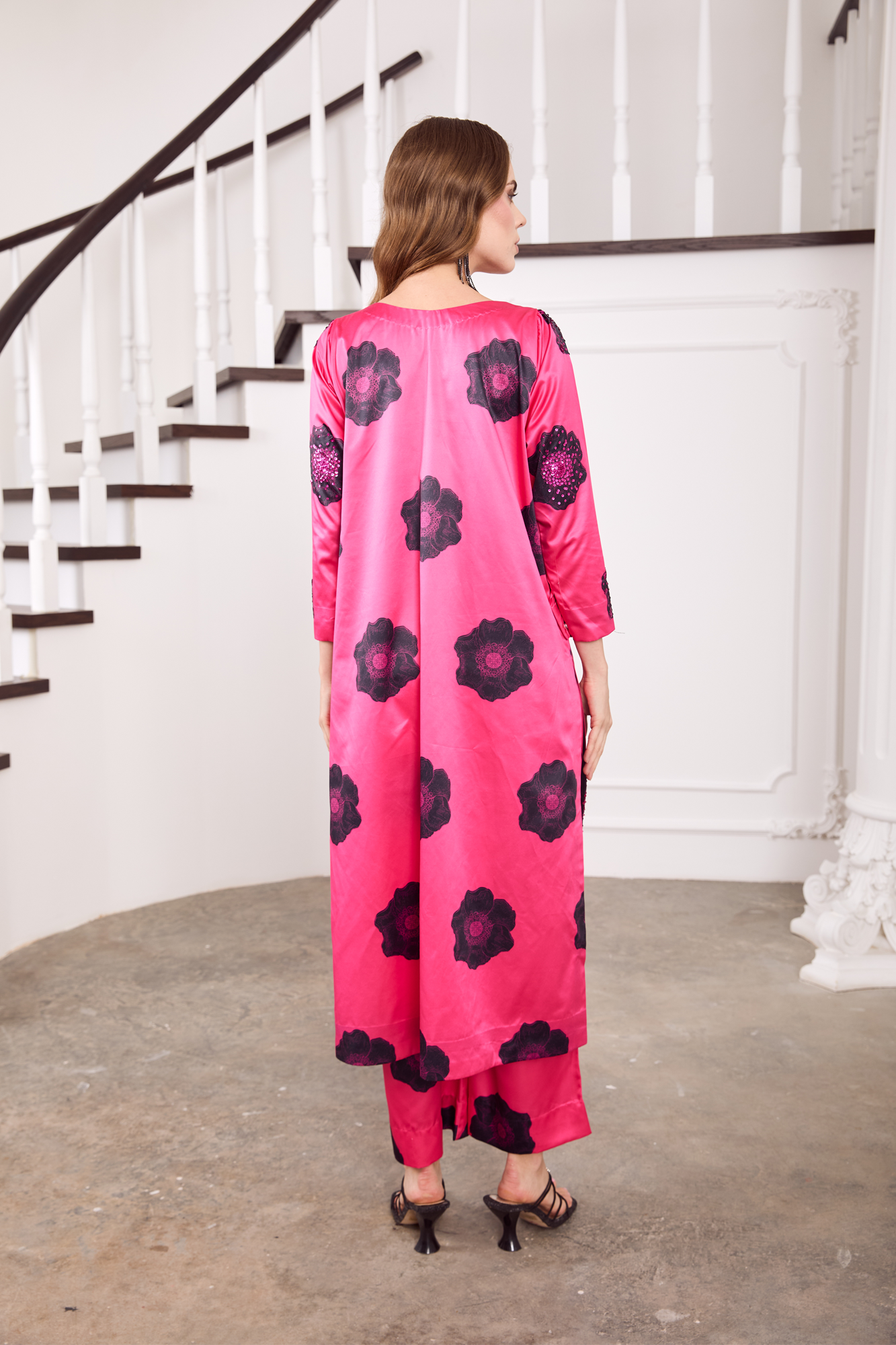Shirt and trouserRadiate bold elegance in this striking charmeuse silk ensemble in a vibrant fuchsia pink hue, adorned with intricate black and Neon Pink floral motifs. The sleek, straight-cut kameez paired with matching wide-leg trousers creates a contemporary silhouette with timeless appeal. The luxurious charmeuse silk fabric drapes beautifully, offering a lustrous finish that enhances its sophisticated charm—perfect for evening soirées, festive celebrations, or refined gatherings.