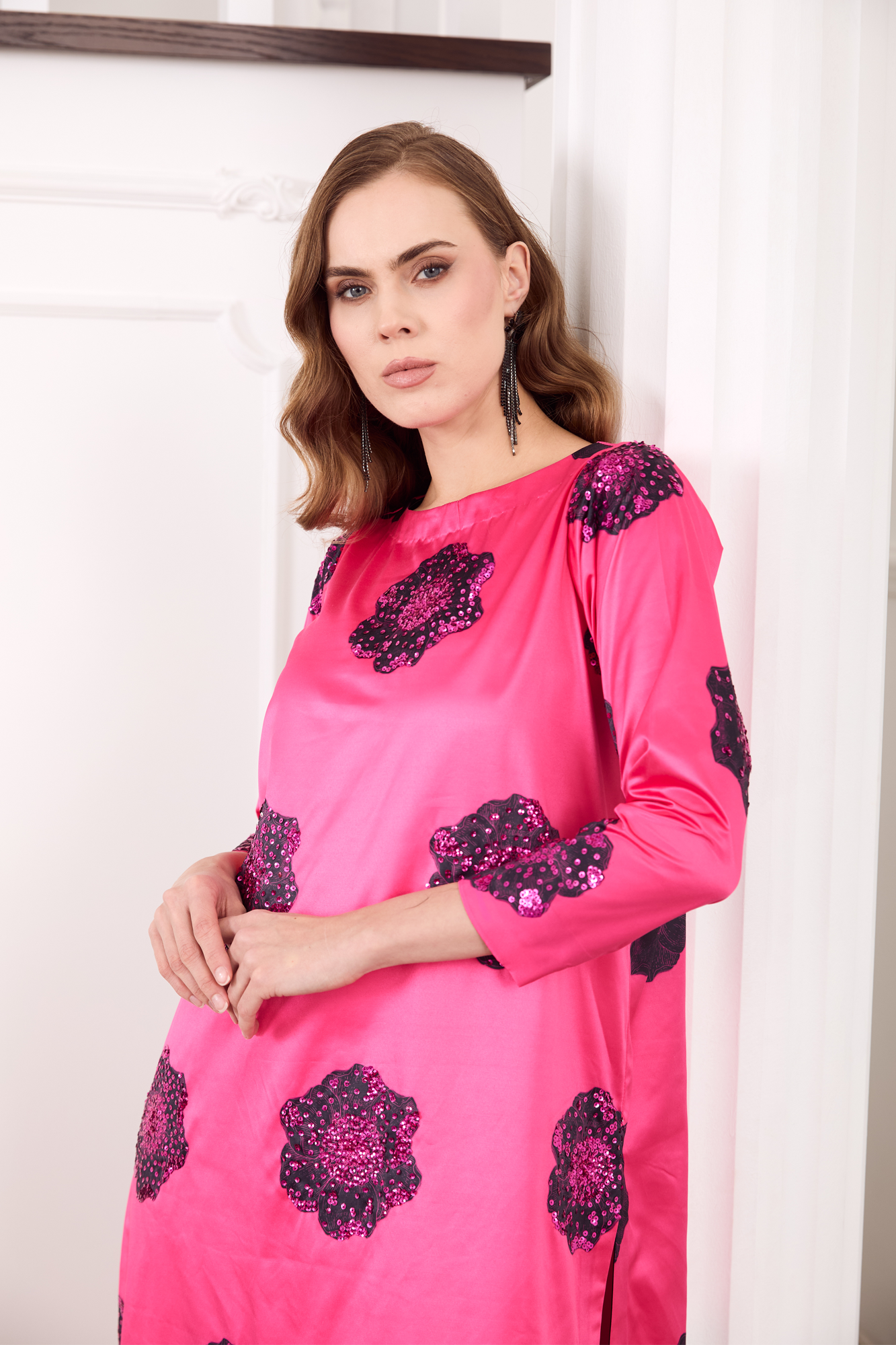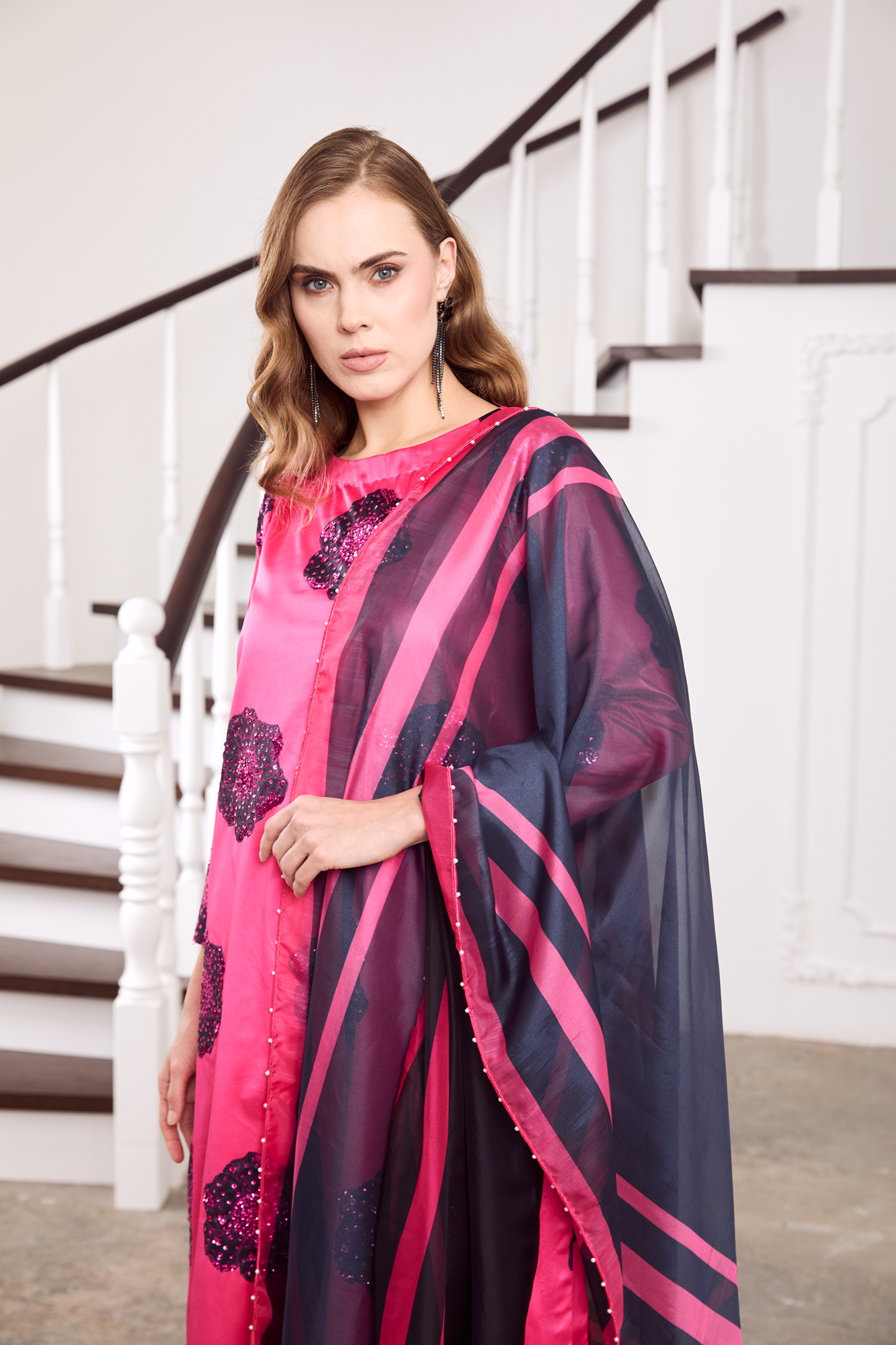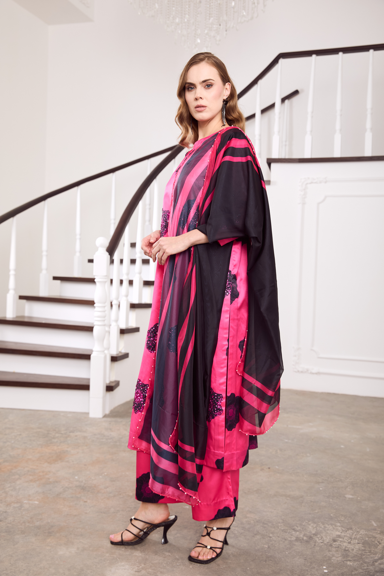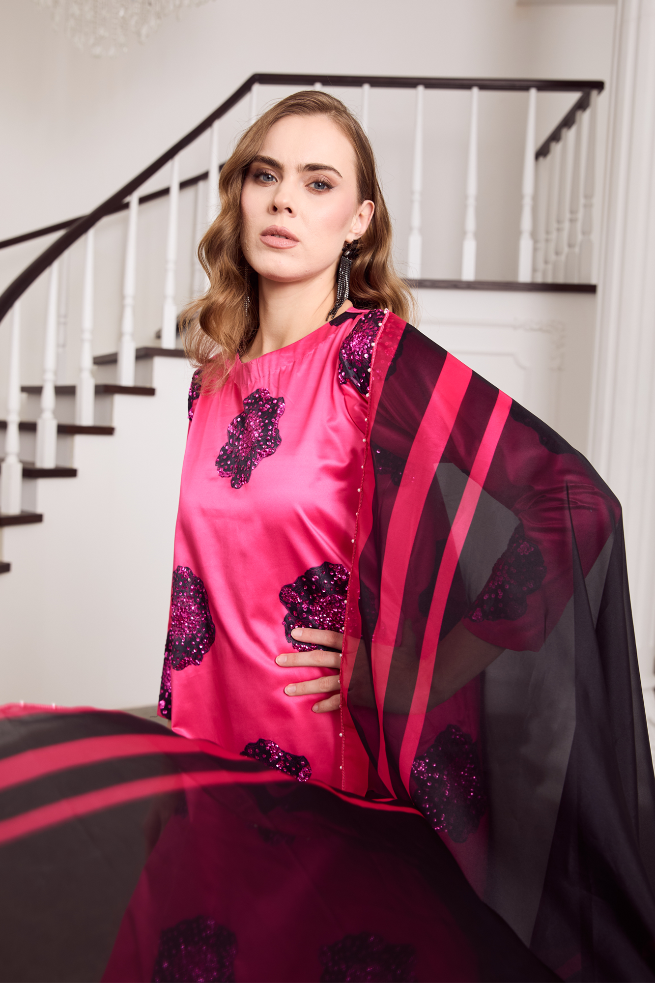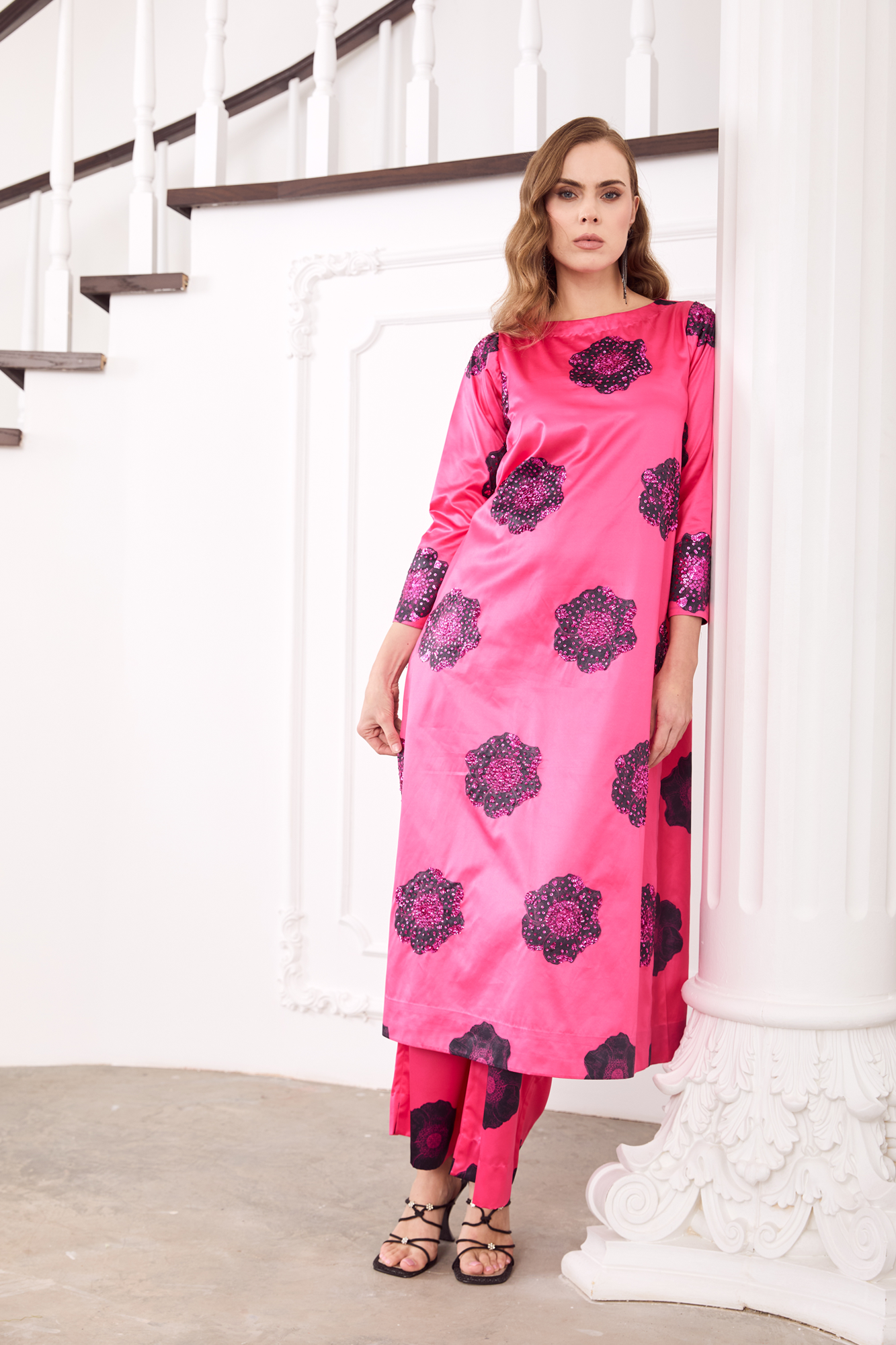 Shirt and trouserRadiate bold elegance in this striking charmeuse silk ensemble in a vibrant fuchsia pink hue, adorned with intricate black and Neon Pink floral motifs. The sleek, straight-cut kameez paired with matching wide-leg trousers creates a contemporary silhouette with timeless appeal. The luxurious charmeuse silk fabric drapes beautifully, offering a lustrous finish that enhances its sophisticated charm—perfect for evening soirées, festive celebrations, or refined gatherings.