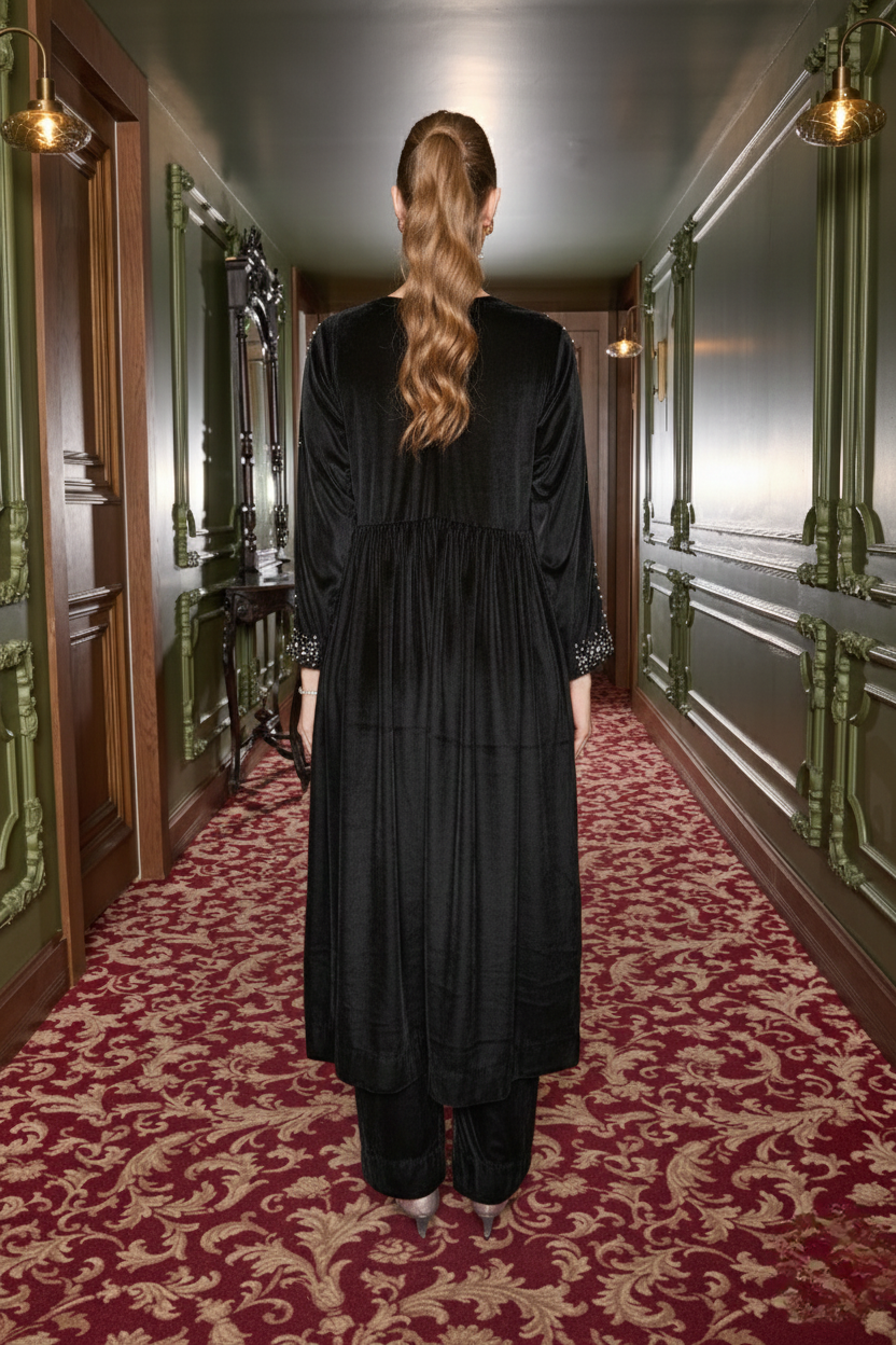 Make a statement in this Black velvet three-piece set, designed to exude timeless sophistication. The flowy velvet shirt features a round neckline and full sleeves adorned with delicate bead embellishments that add a radiant sparkle. Paired with matching velvet trousers for a graceful finish and a lightweight dupatta to complete the look, this ensemble is perfect for festive occasions and formal gatherings.