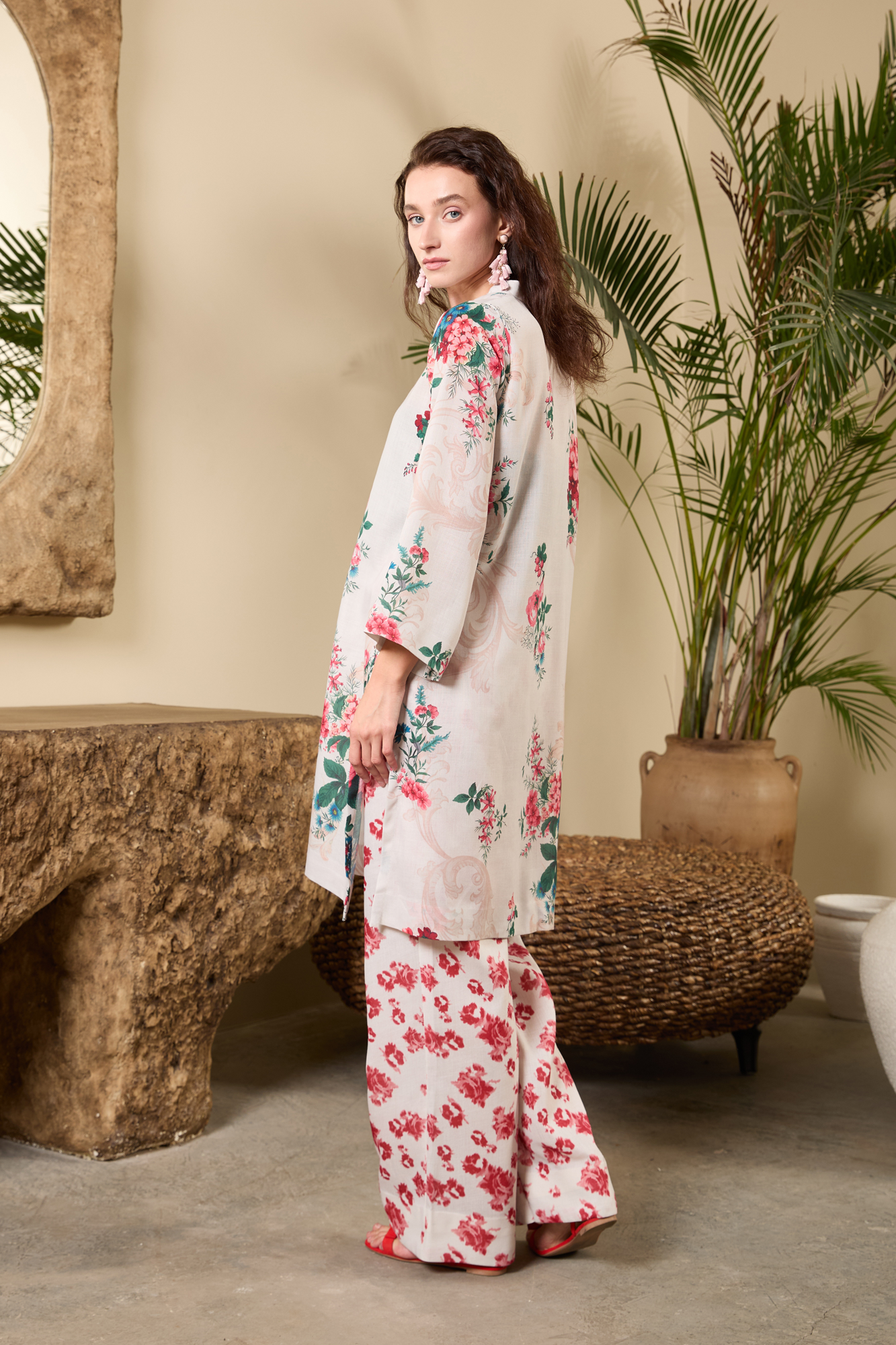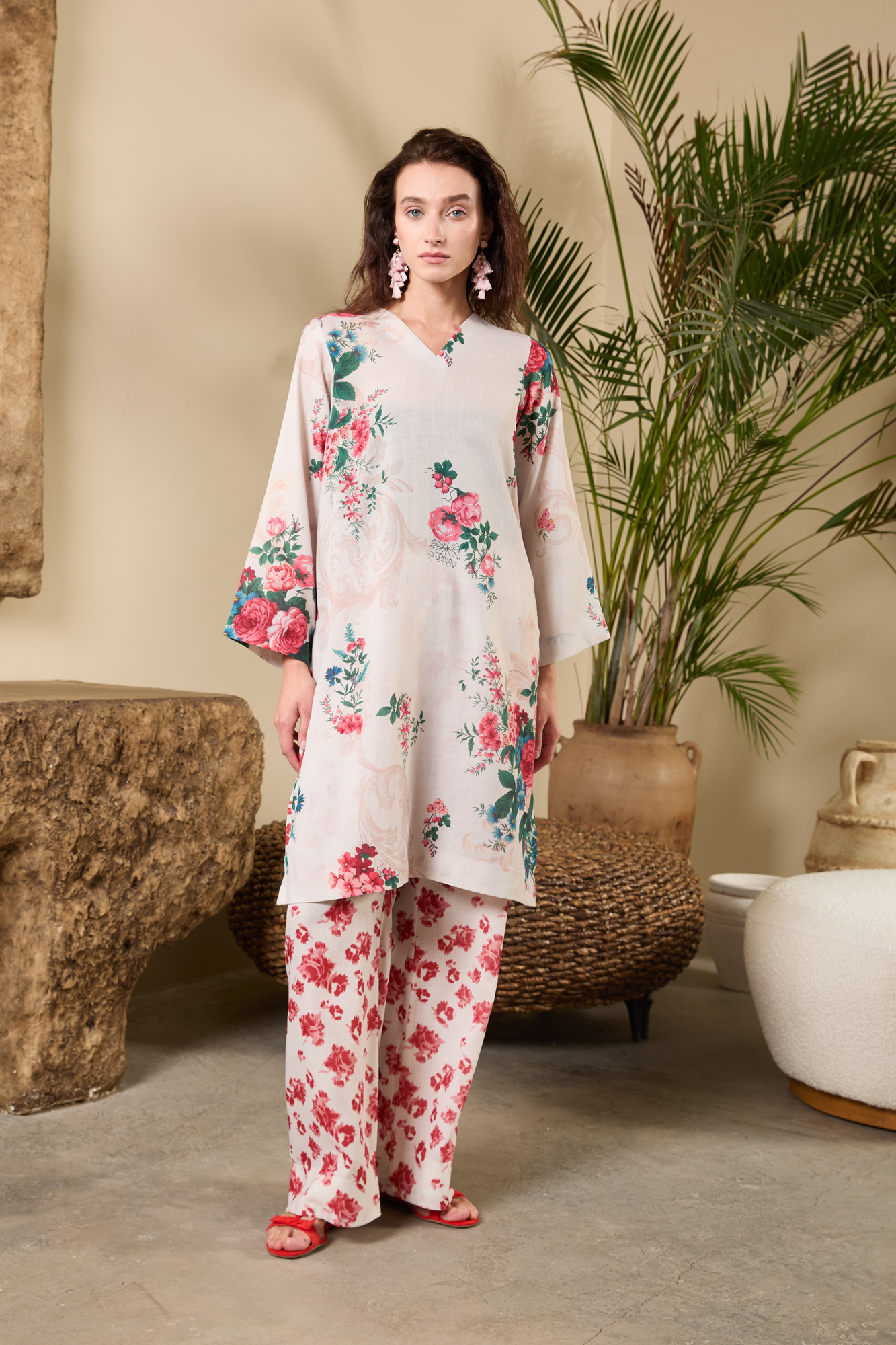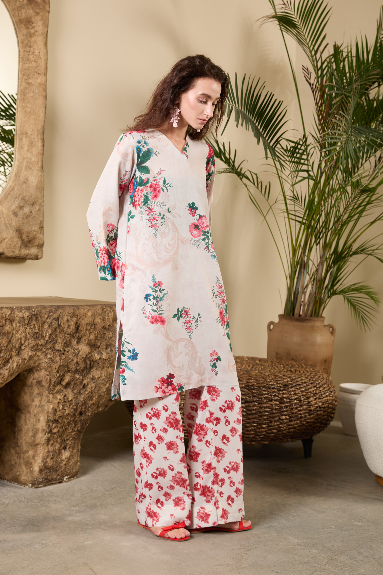 Floral Whisper Ensemble in Khadar Wrap yourself in understated elegance with this Floral Whisper Ensemble crafted from soft, breathable Khadar. The soothing ivory base is adorned with delicate floral prints, complemented by a deep rose dupatta featuring intricate golden botanical motifs. A timeless blend of warmth, comfort, and sophistication — perfect for cozy winter days and graceful gatherings.
