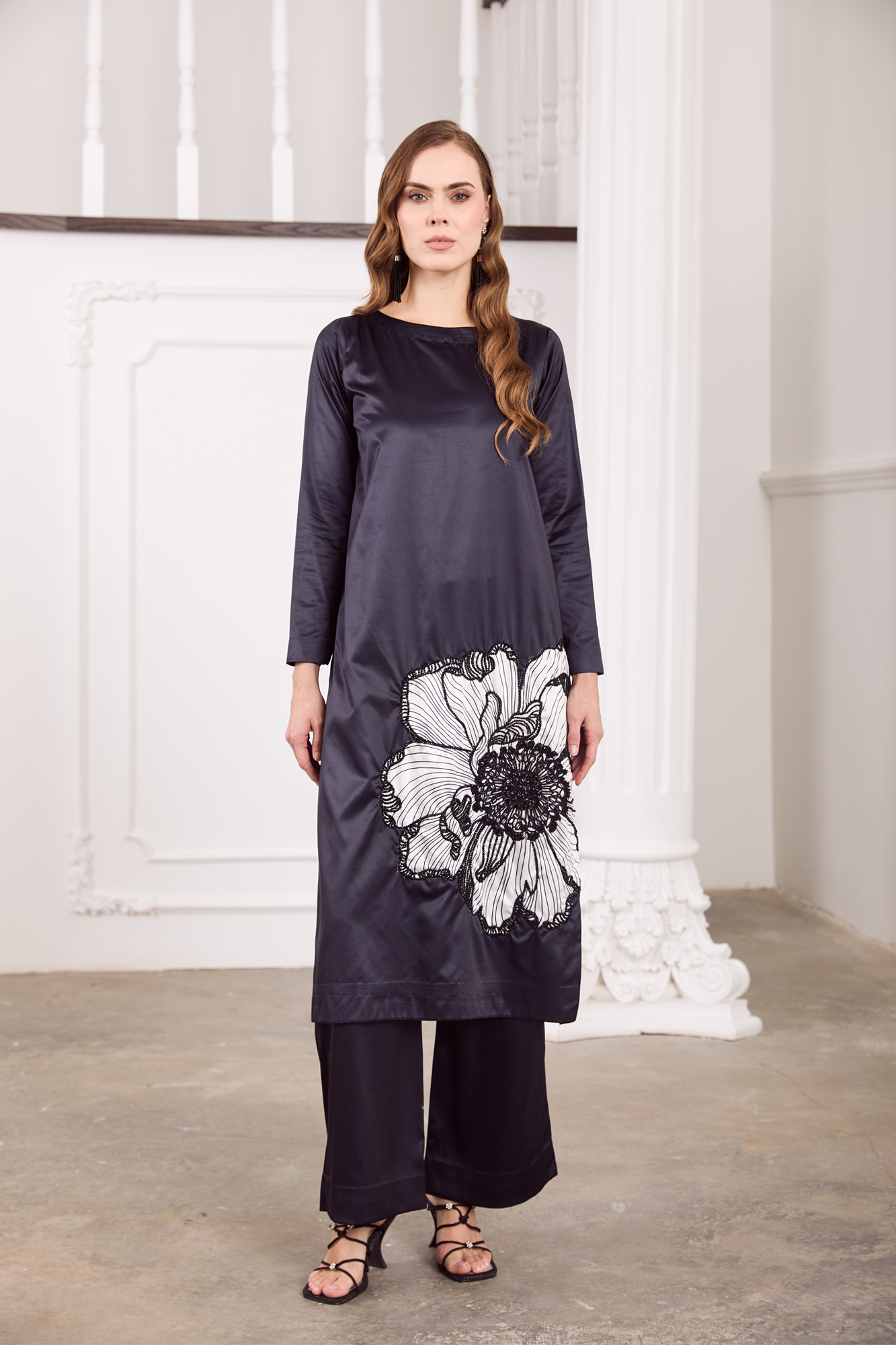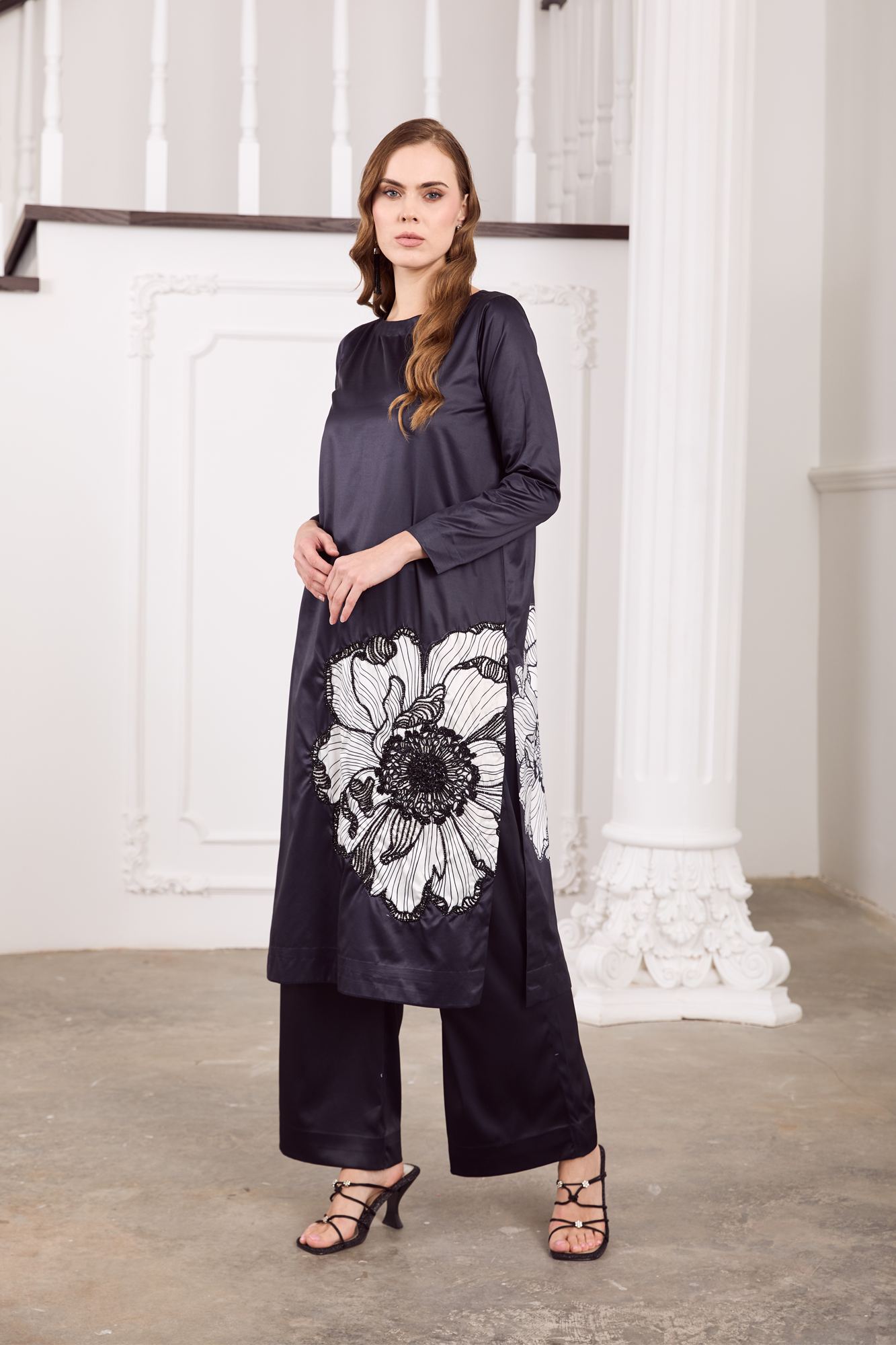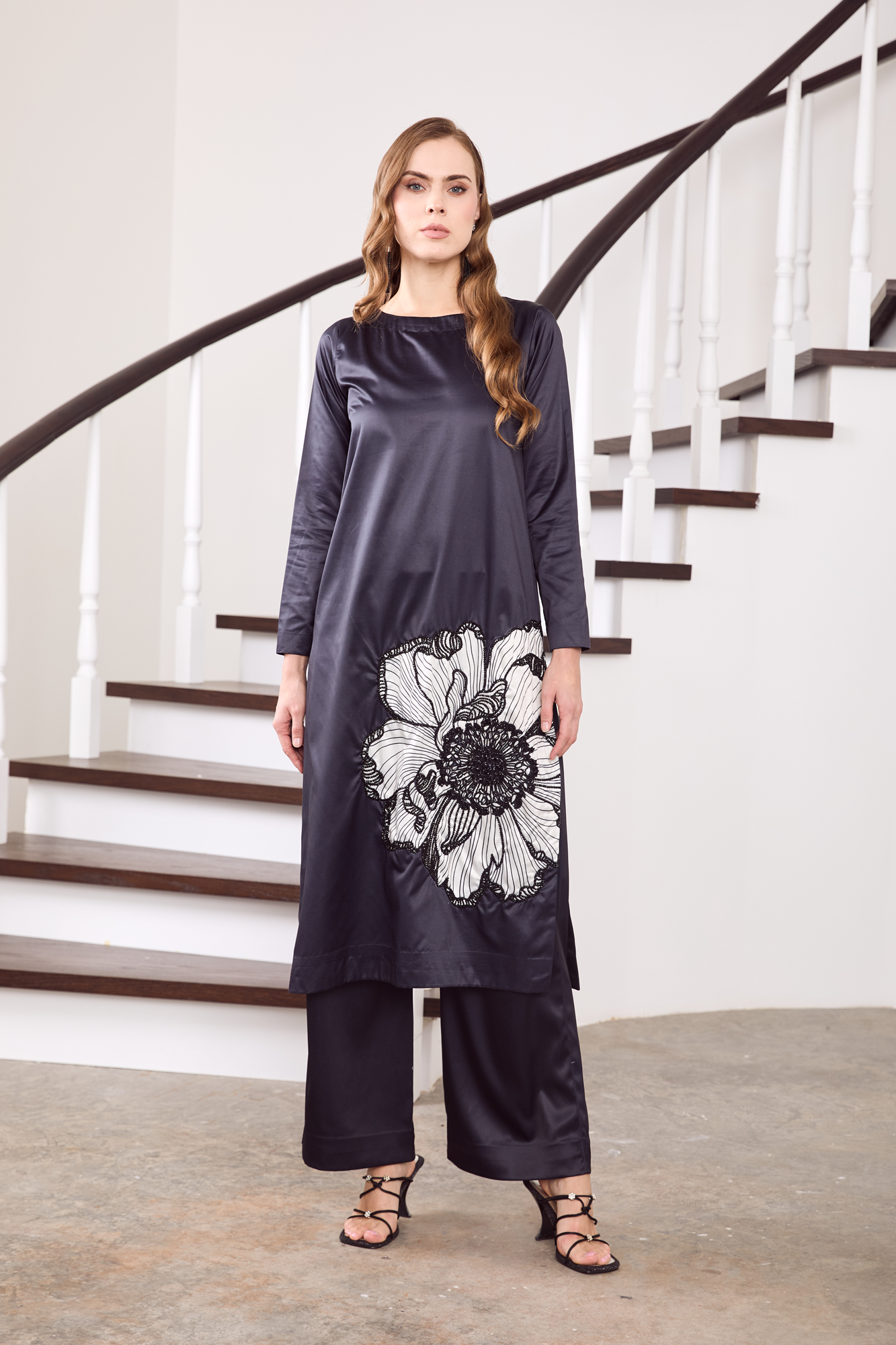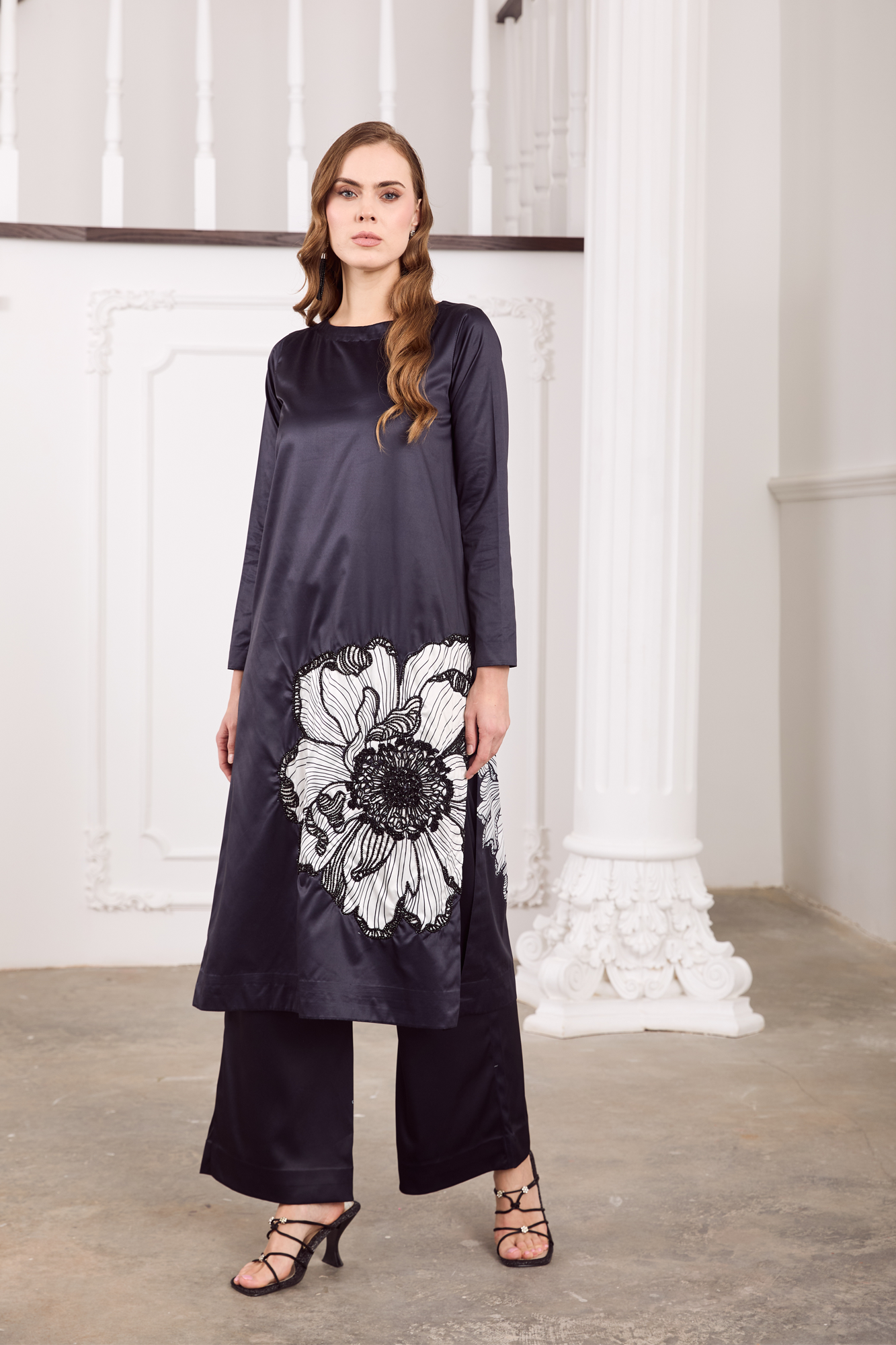 Shirt and trouserExude understated elegance in this midnight-charcoal charmeuse silk ensemble, adorned with an exquisite oversized floral motif in monochrome Stone embellishment. The sleek straight-cut silhouette gracefully drapes along the body, while the wide-leg trousers lend a touch of contemporary poise. Crafted from lustrous silk, this outfit seamlessly blends modern minimalism with artistic detail—perfect for evening soirées, formal gatherings, or festive celebrations that call for quiet sophistication.