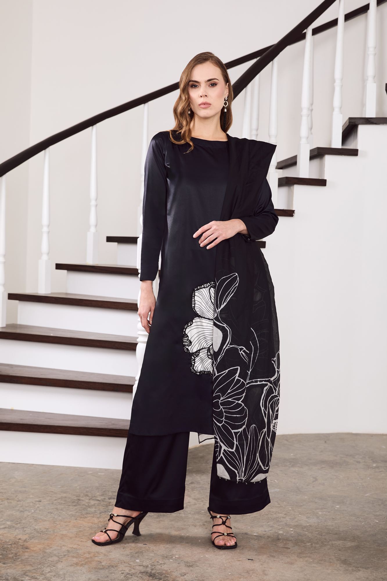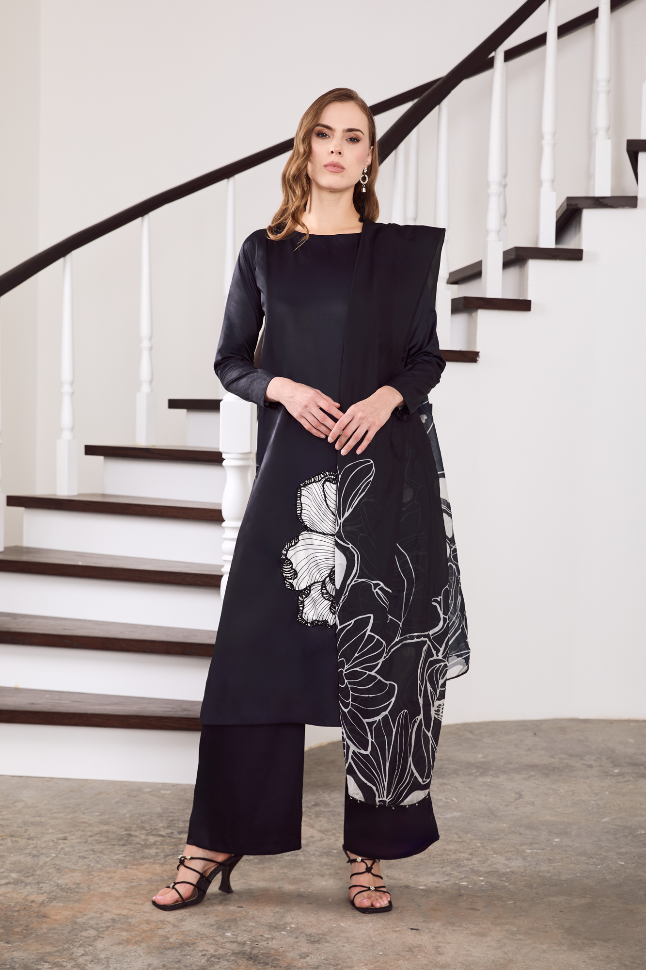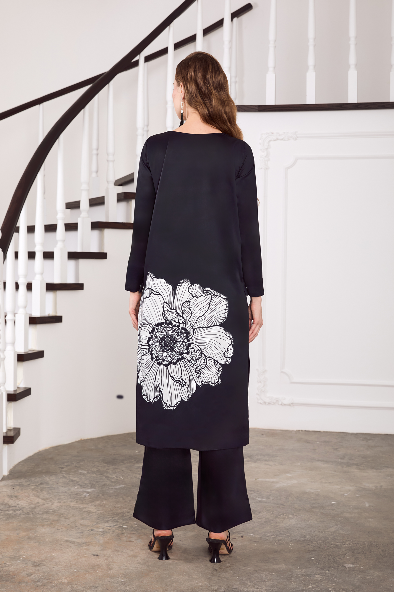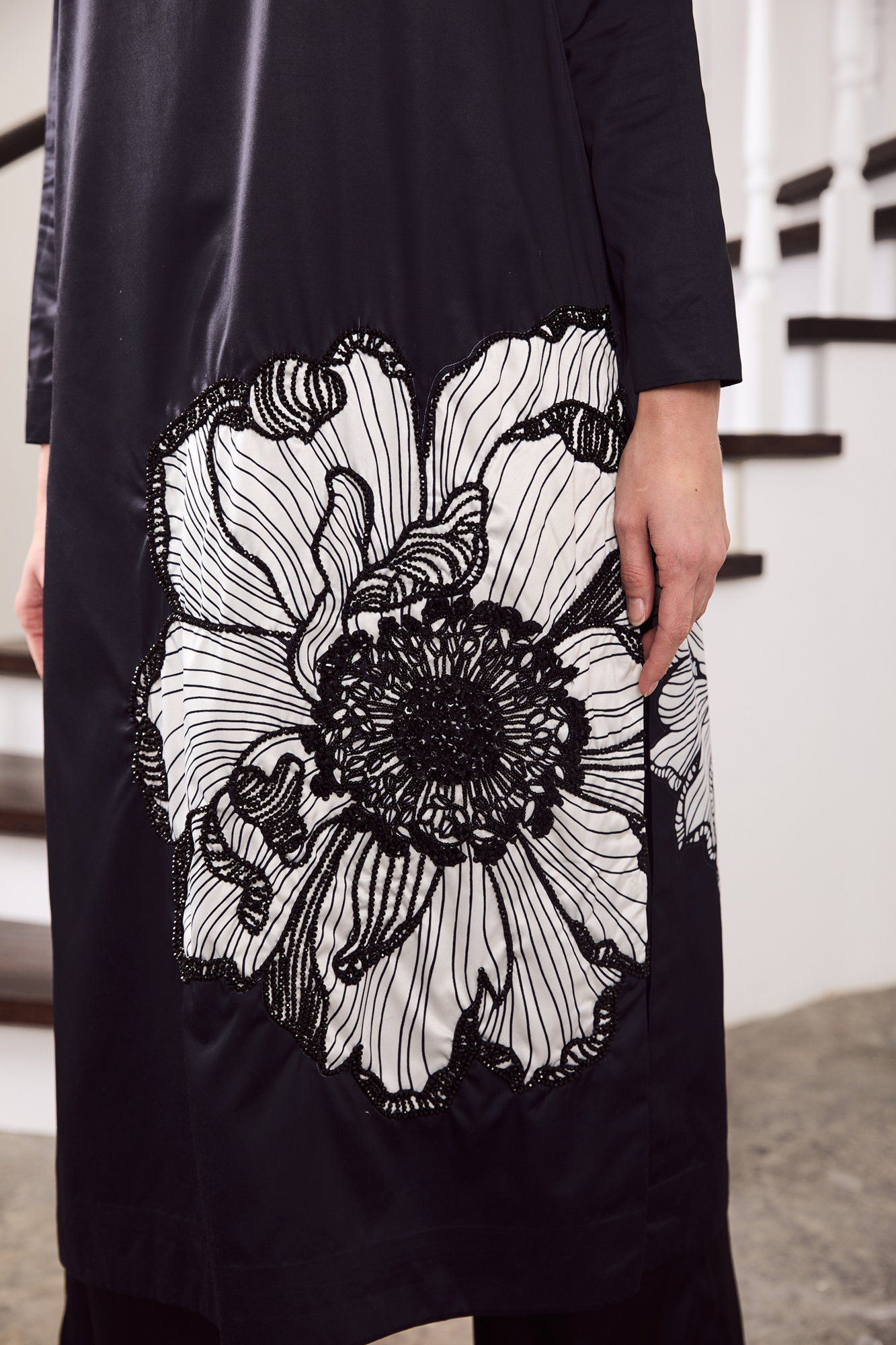 Shirt and trouserExude understated elegance in this midnight-charcoal charmeuse silk ensemble, adorned with an exquisite oversized floral motif in monochrome Stone embellishment. The sleek straight-cut silhouette gracefully drapes along the body, while the wide-leg trousers lend a touch of contemporary poise. Crafted from lustrous silk, this outfit seamlessly blends modern minimalism with artistic detail—perfect for evening soirées, formal gatherings, or festive celebrations that call for quiet sophistication.