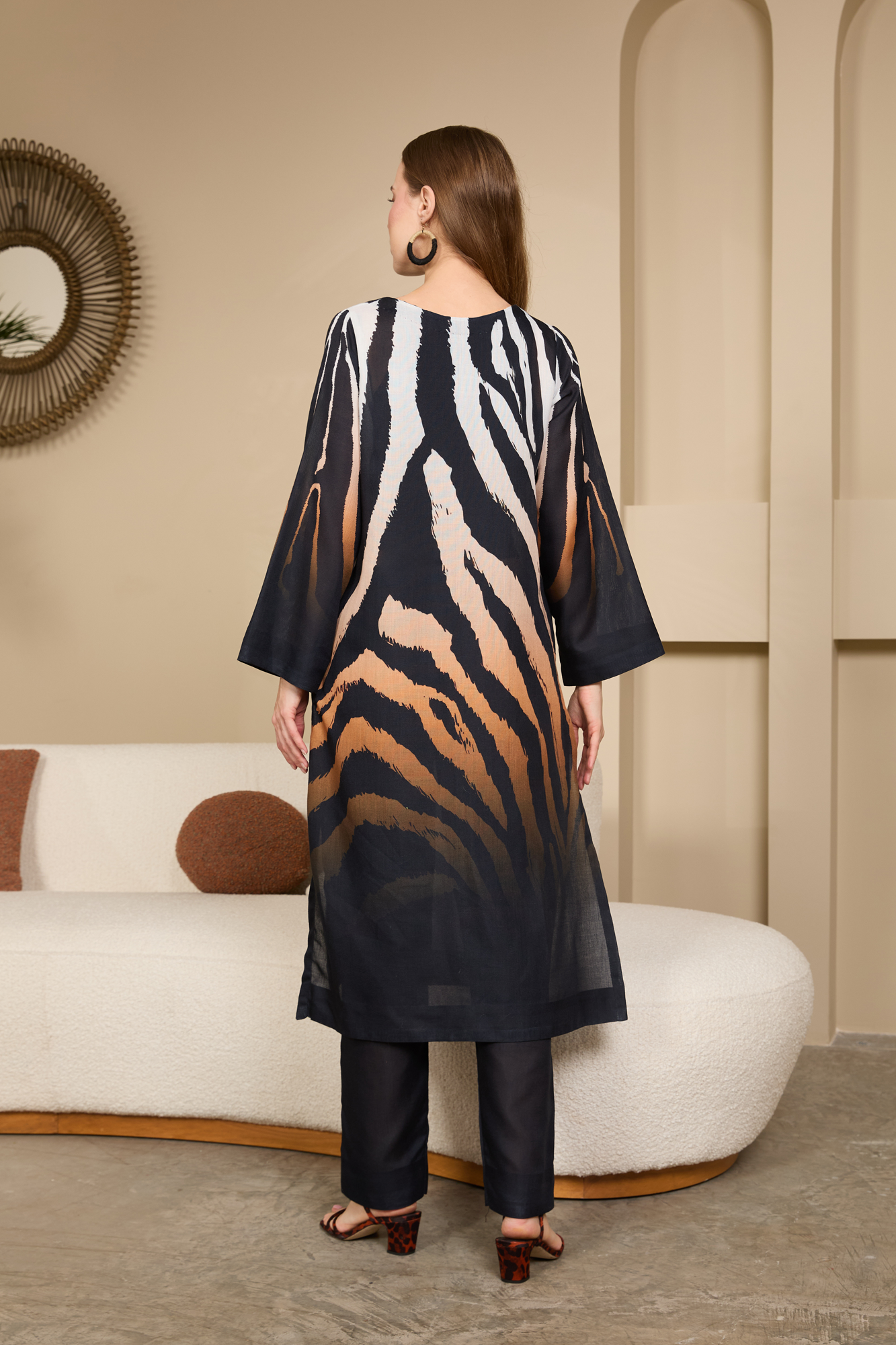 Unveil your bold sophistication with our Black & Ochre Striped Soft Crepe Set. Crafted from premium Soft Crepe fabric, this three-piece creation exudes modern elegance and daring style. The striking shirt features a dynamic blend of black and ochre tiger stripes, creating an effortlessly chic statement piece. Paired with sleek black trousers, the design maintains a sense of balance and refinement. The luxurious dupatta, with its rich gradient from deep black to warm ochre, adds a regal touch. Perfect for high-end gatherings, this ensemble embodies confidence, elegance, and contemporary luxury.